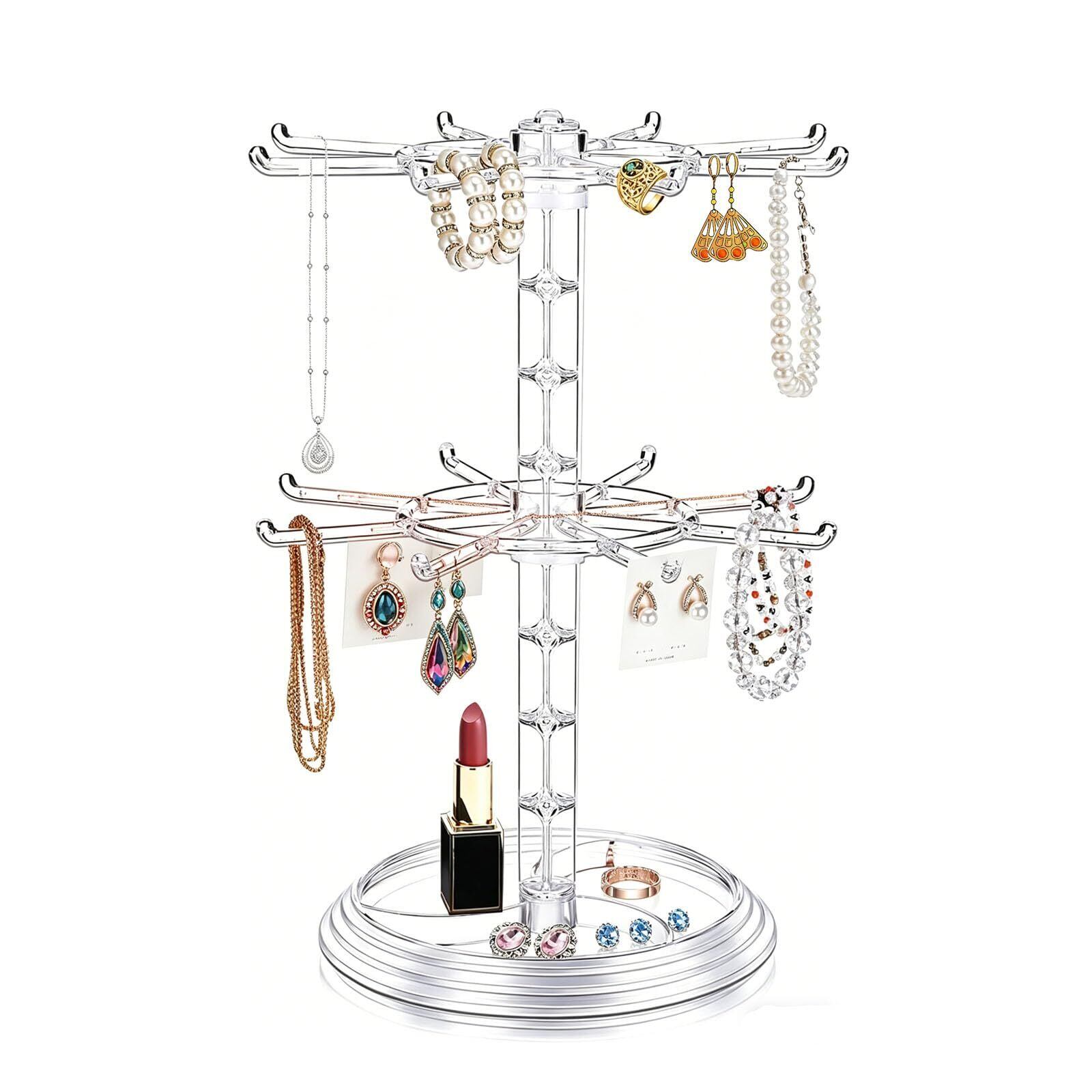 【在庫処分】アクセサリースタンド ジュエリースタンド大容量 360 度回転 省スペース リングスタンド 吊り下げオーガナイザー ホルダー 調節可能 ネックレス 鍵 小物 ジュエリー収納 (2 段式-クリア)
