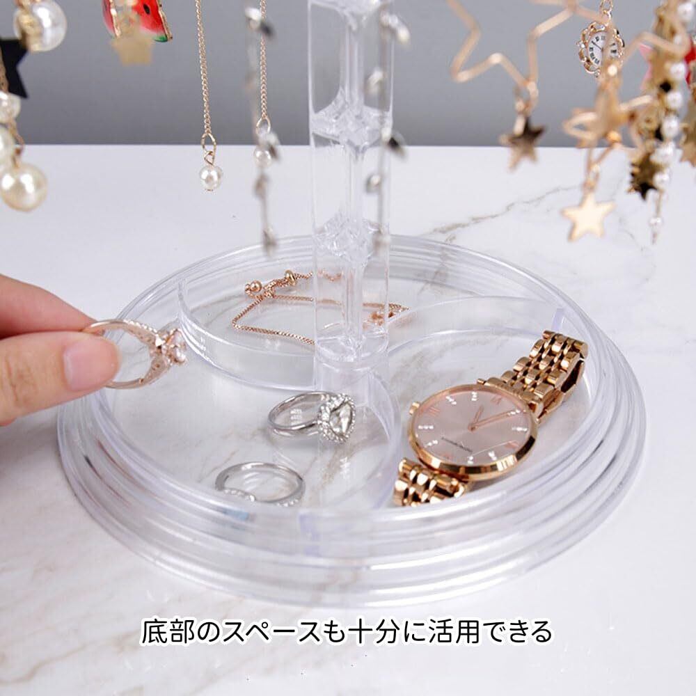 【360度回転ジュエリースタンド】ジュエリースタンドは360度スムーズに回転する機能を備え、ネックレス、ブレスレット、イヤリングなどのアクセサリーを簡単に取り出せます!二重構造で収納容量を最大化し、ネックレススタンドとして使用する際は長いネックレスも絡まずに整然と収納できます。