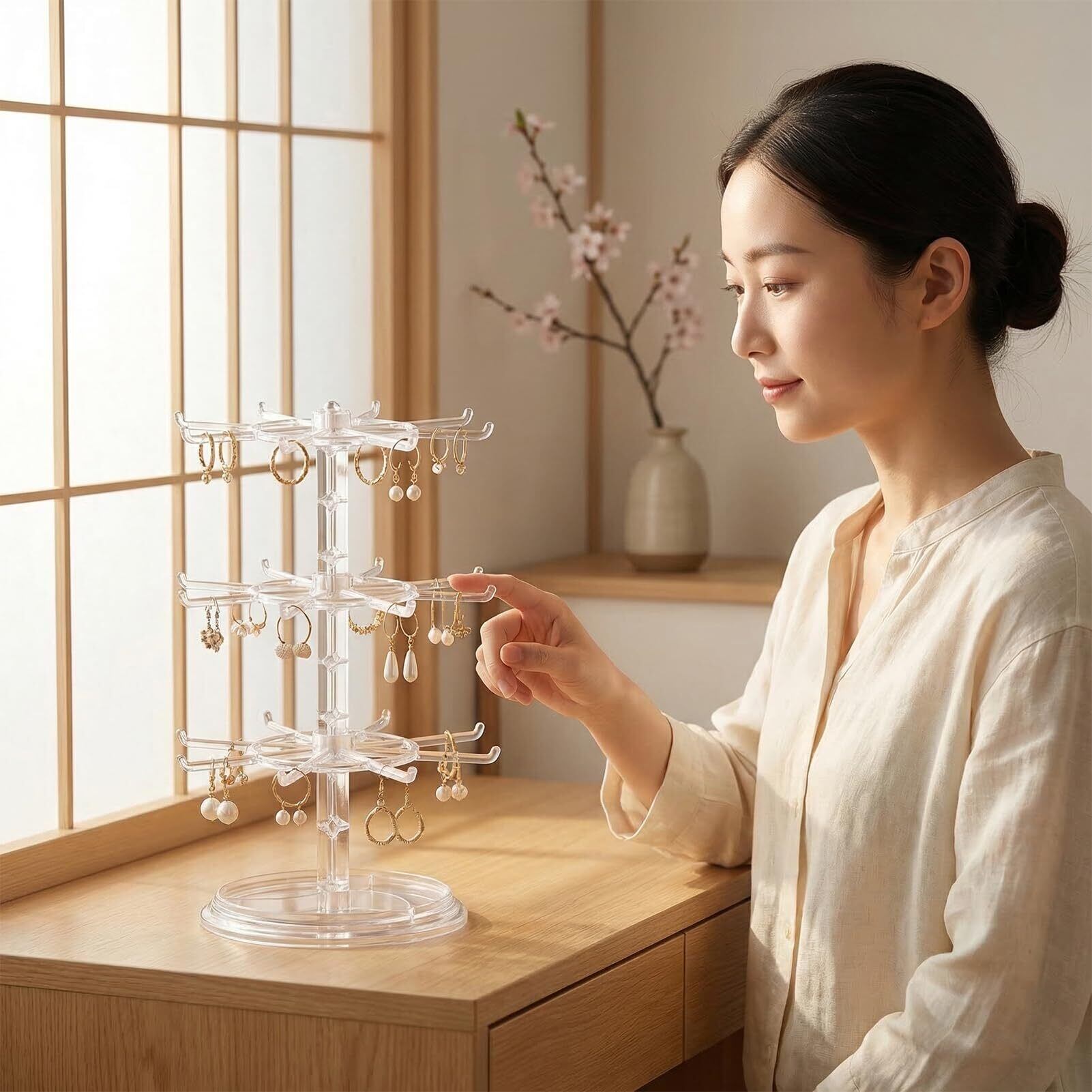【多シーン対応 & コレクション展示に最適な万能スタンド】化粧台やデスクでの日常的なアクセサリー整理はもちろん、オフィス、ホテル、店舗での商品陳列、推し活グッズ(キーホルダー・ガチャ景品など)の展示にも活躍します。誕生日や記念日のプレゼントとしても喜ばれるデザインで、透明タイプはアクセサリーの美しさを際立たせ、ブラックタイプは落ち着いた雰囲気でコレクションを引き立てます。イベントやギフトディスプレイなど、様々な場面で大活躍する万能な収納グッズです。