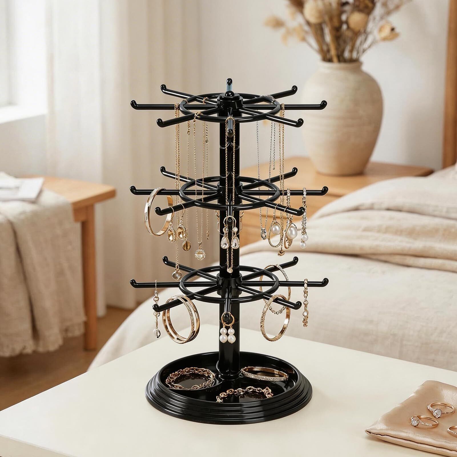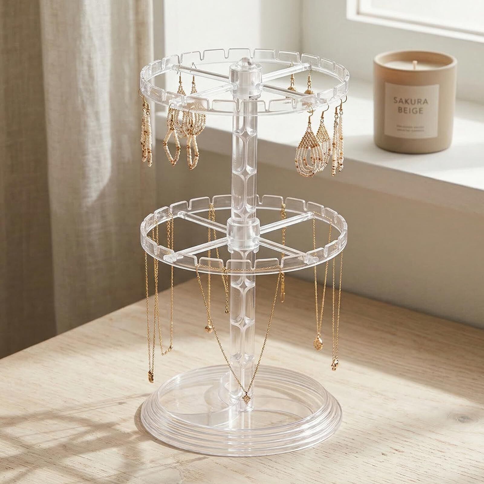 【360° スムーズ回転機構、瞬時に目的のアクセサリーを取り出せる】底部に高品質ベアリングを搭載し、360° の滑らかな回転を実現。回転時の音も静かで、重みのある安定した土台により転倒の心配がなく、どの角度からでも大切なアクセサリーを確認・取り出し可能です。朝の忙しい準備時間でも、目的のネックレスやブレスレットをサッと手に取れるため、ストレスフリーなアクセサリー管理が叶います。