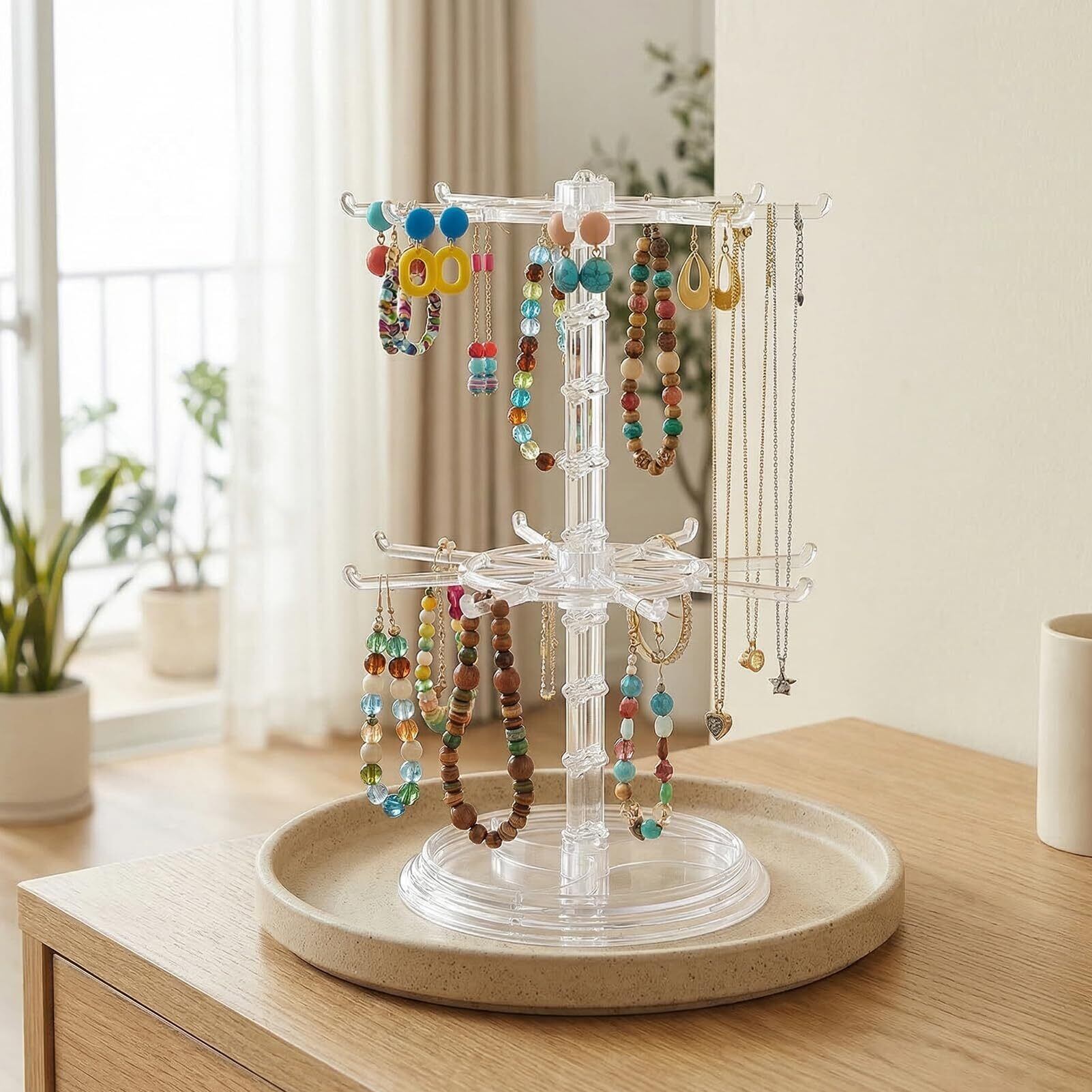 【多層フック設計で大容量収納、デスクをすっきり整頓】3 層タイプは計 16 本のフック、2 層タイプは計 8 本のフックを備え、ネックレス、ブレスレット、キーホルダー、ヘアアクセサリーなどを種類ごとに分類整理可能。イヤリングスタンドは耳飾りをワンタッチで掛けられる構造で、ピアスやフープイヤリングの絡まりを防ぎます。縦型設計はデスクや化粧台のスペースを節約し、散乱しがちな小物を一箇所にまとめて、清潔感のある空間を演出します。
