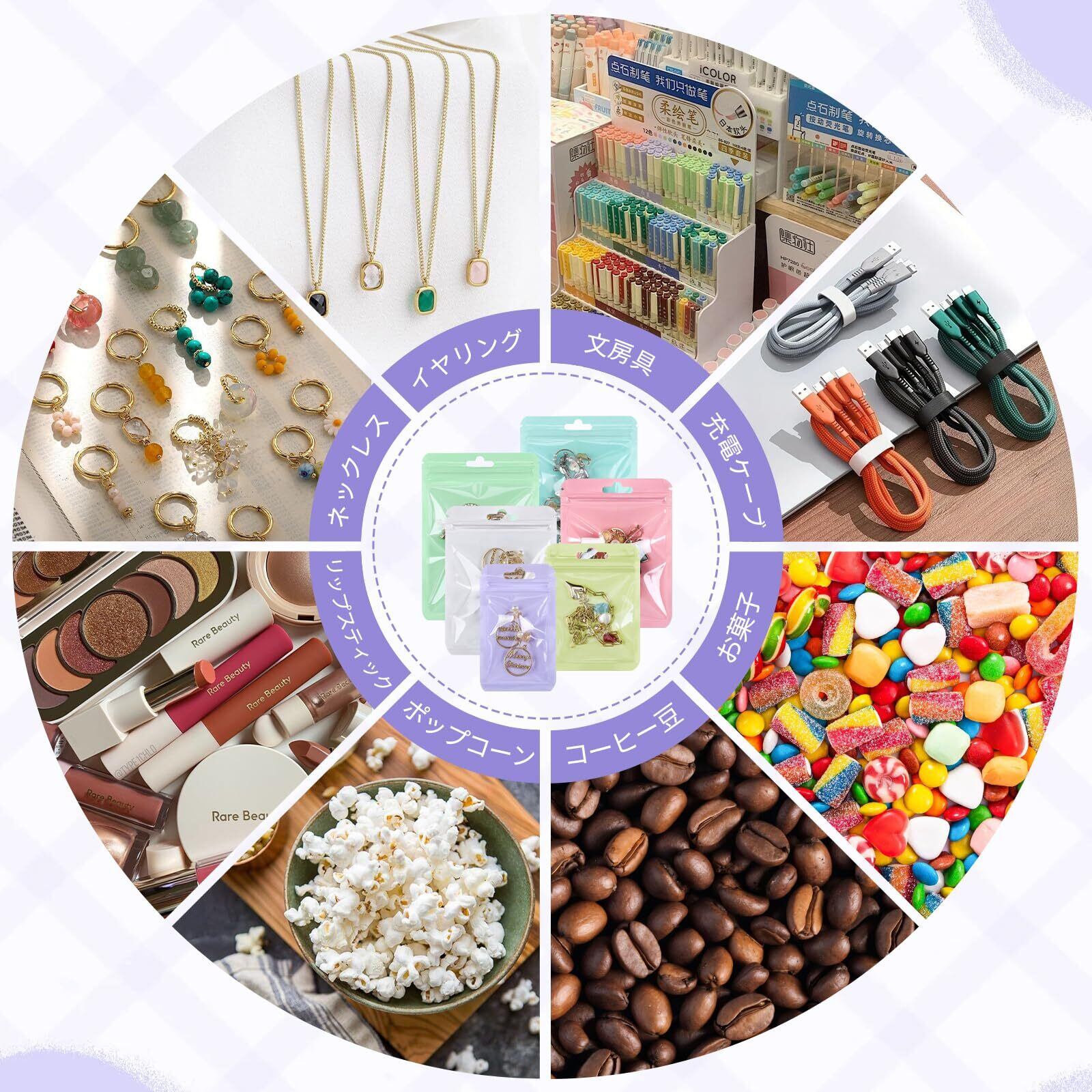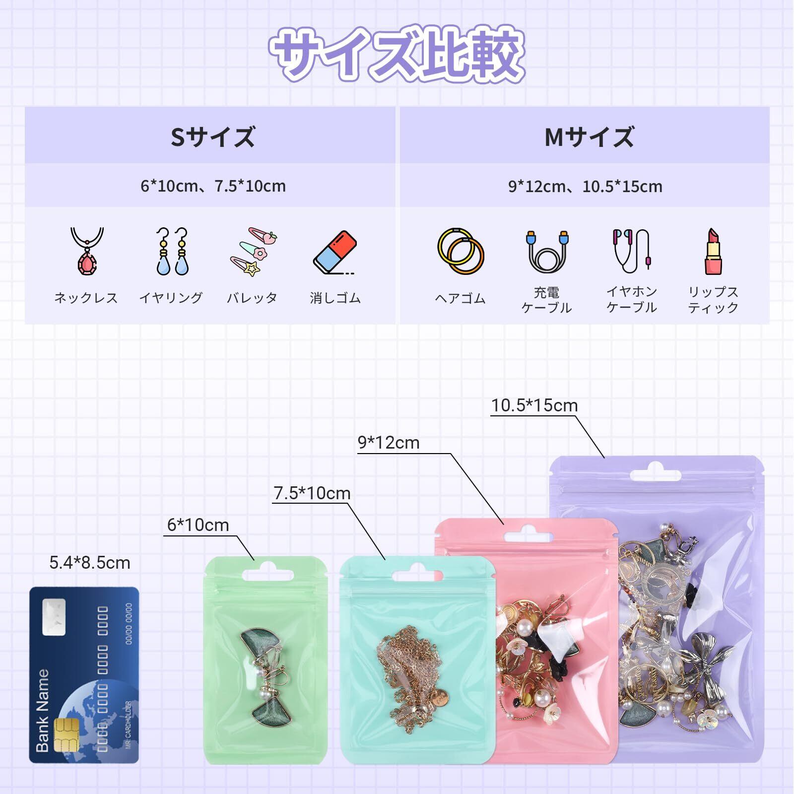 使用シーン:アクセサリーの保管、旅行時の仕分け、文房具や電子部品の整理、化粧品のサンプル整理、手芸用品の収納、プチギフトのラッピングなど。