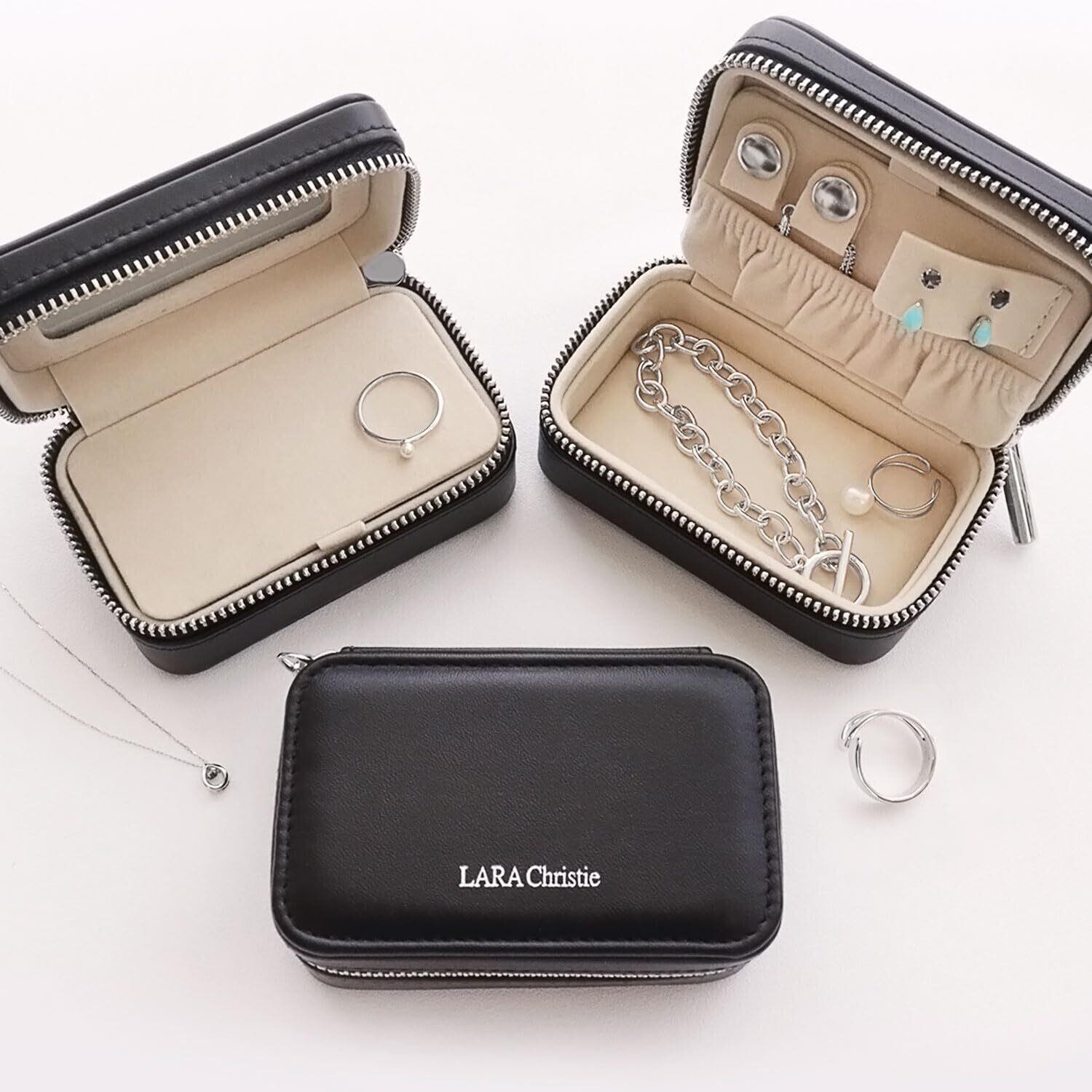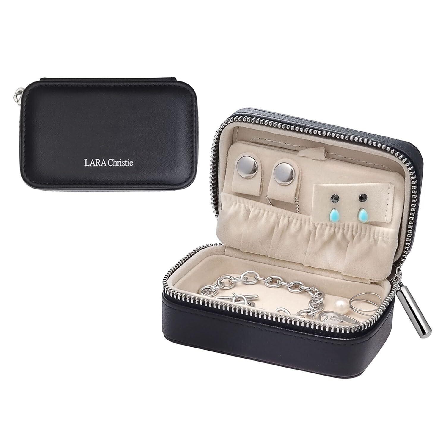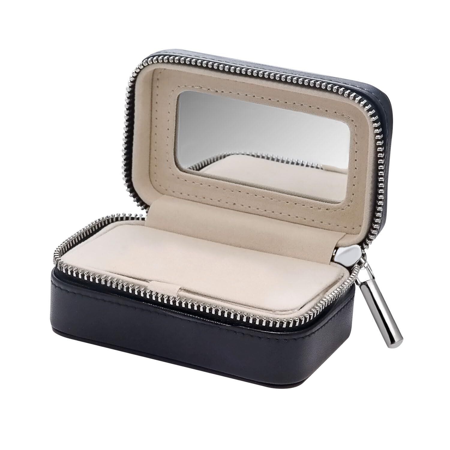 【新春セール】ジュエリー ポーチ ミラー付き アクセサリーケース ジッパー 黒 持ち運び 携帯用 フェイクレザー コンパクト男女兼用 ギフト対応