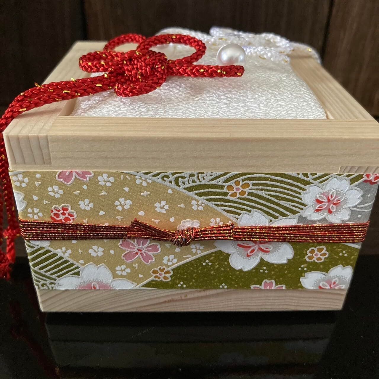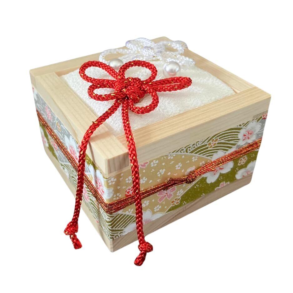 【指輪を美しく飾るちりめんクッション】 ひのき升の中には、ふっくらとした「ちりめん」のクッションを敷き詰めました。クッションの上には2つのパールがあしらわれており、大切な結婚指輪(マリッジリング)を安定して美しく乗せることができるよう工夫されています。