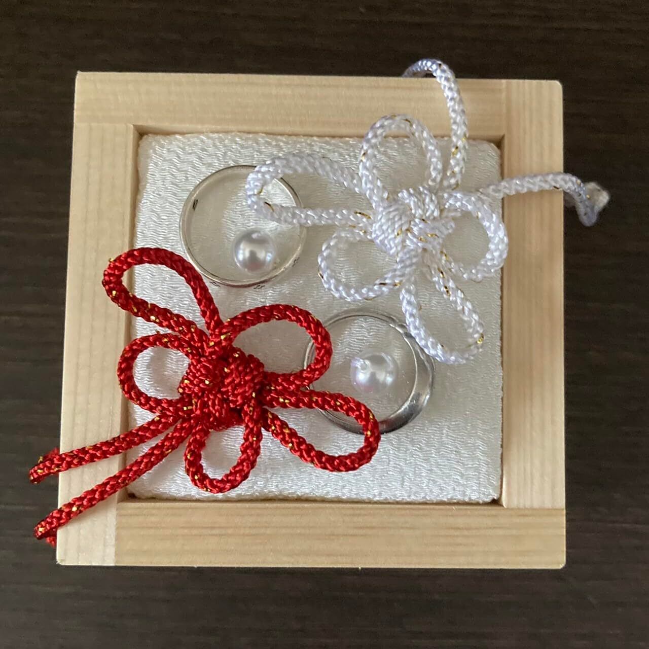 【和婚・神前式にぴったりのリングピロー】 鏡開きなどで縁起物として振舞われる「一合升」を使用し、紅白の組み紐(くみひも)で可愛らしく仕上げた和風のリングピローです。白無垢や色打掛を着る和装ウェディングや、神社での神前式に相性抜群の洗練されたデザインです。