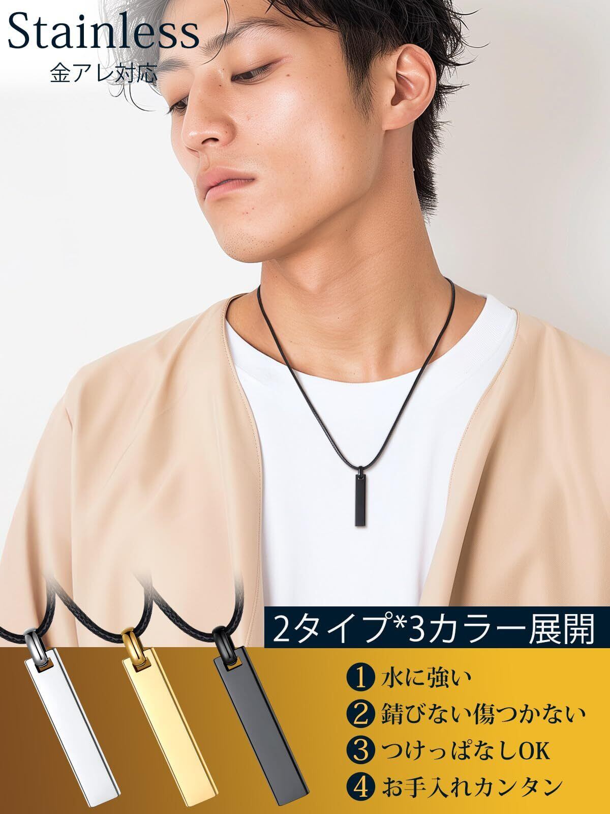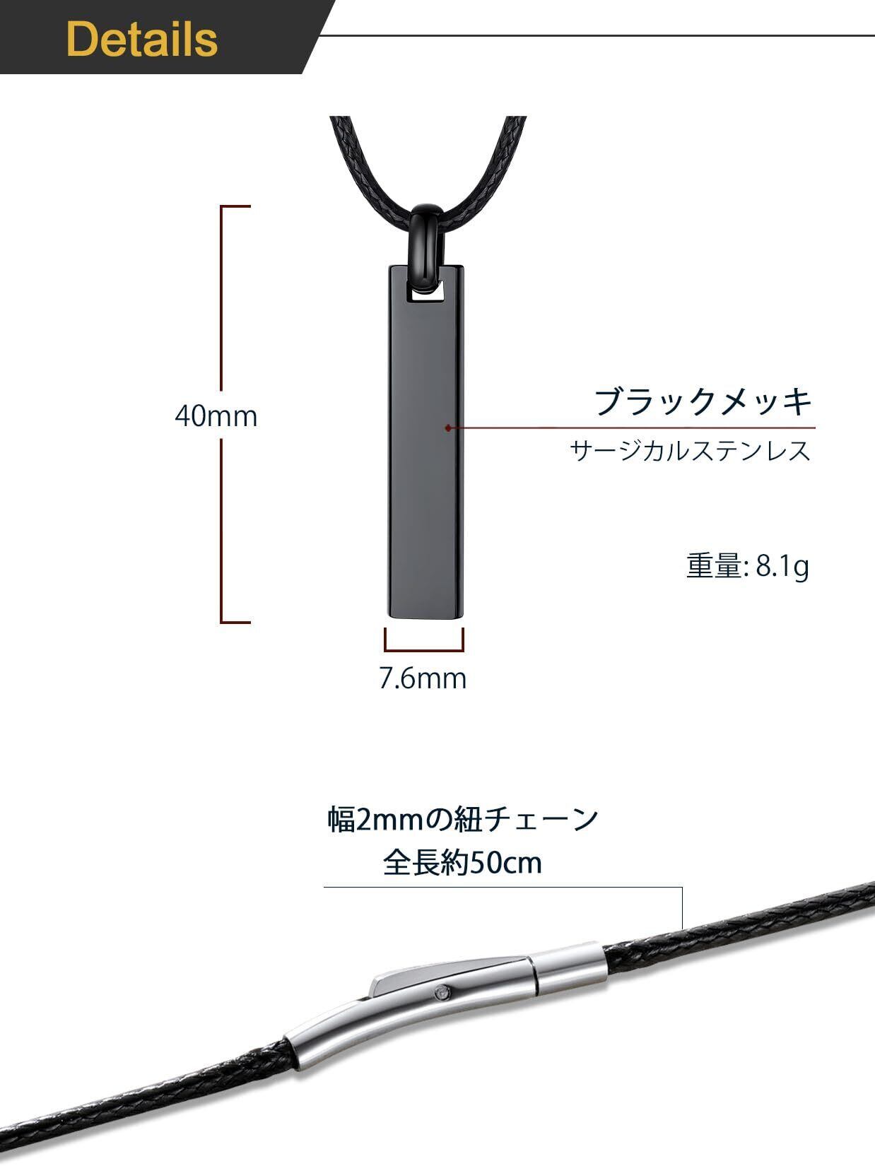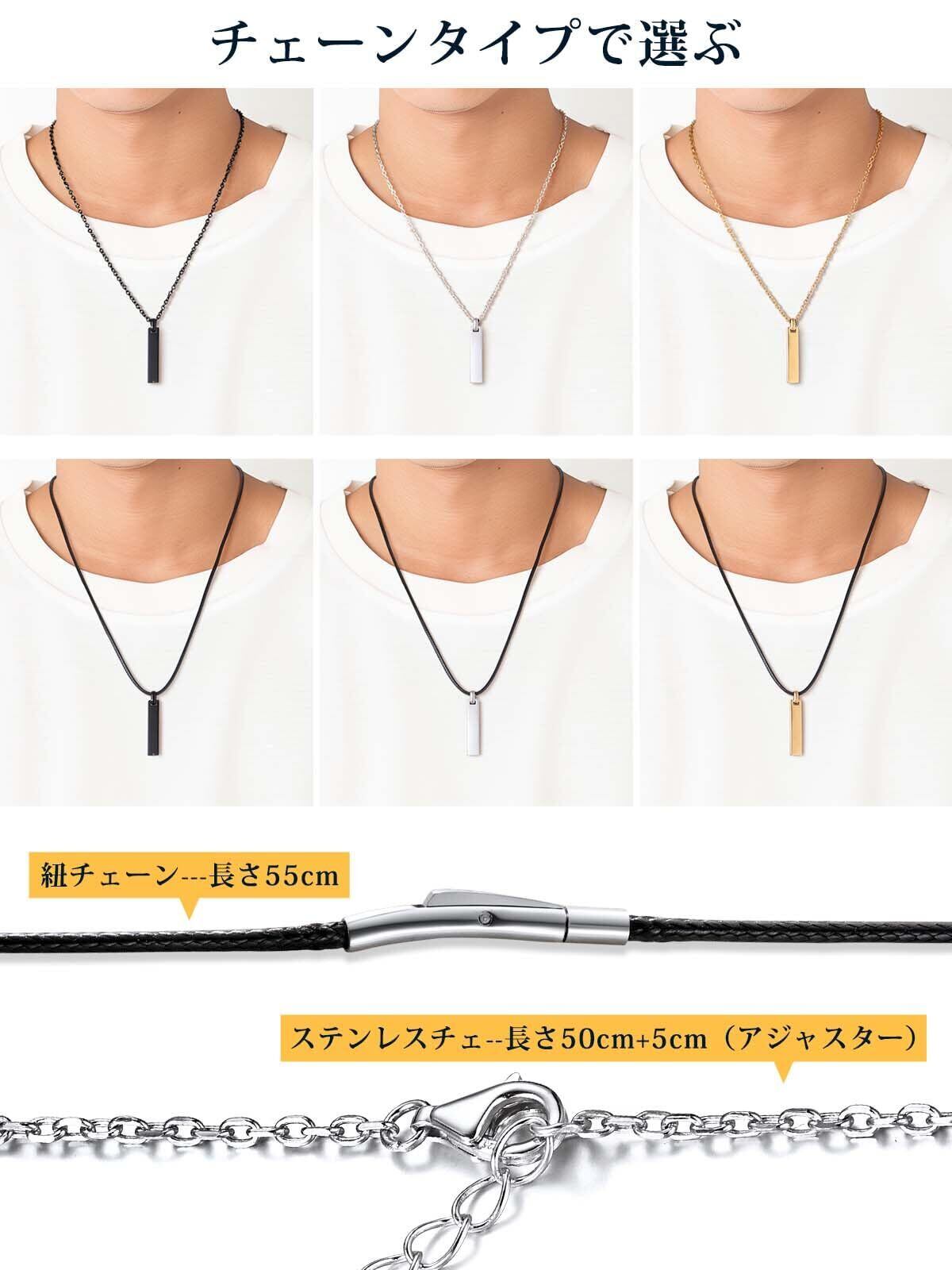 【紐チェーン&ステンレスチェーン】ネックレスチェーンは二つタイプがあり、お好みに選べます。幅2mm×長さ55cmの革紐、幅2.5mm×長さ50cm+5cmアジャスターのステンレスチェーン、それぞれ計6種類ご用意しております。お気に入りの商品が見つかるため、幅と長さを自由に選べます。メンズが幅と長さの違いによって、その日のスタイルに合わせて、自由にアレンジを楽しんでください!