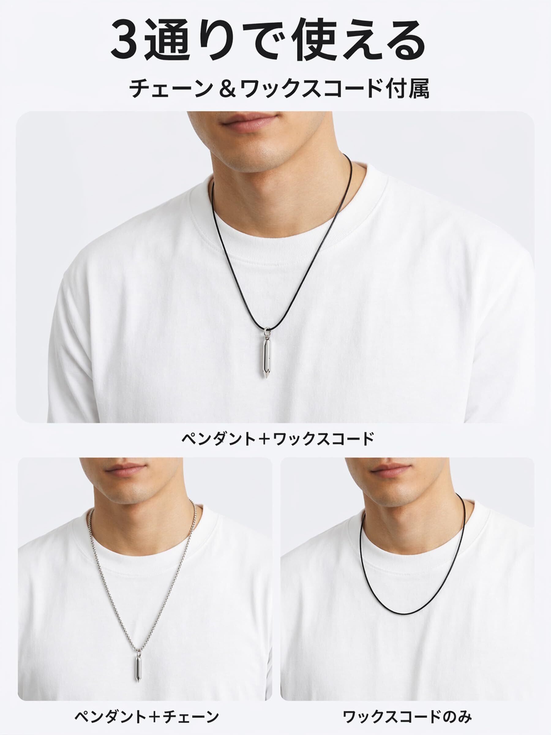 メンズ向けの3WAYネックレスです。ネックレス、ペンダント、チョーカーとして雰囲気を変えながら使いやすく、シンプルなコーデにも取り入れやすいデザインにまとめています。シルバーカラーのパーツとワックスコードの組み合わせが、重ね付け風の印象を自然に演出し、Tシャツ、シャツ、ジャケットなど幅広いスタイルになじみやすい仕様です。カラーはブラックとブルーの2色から選べるため、落ち着いた雰囲気で合わせたいときも、コーデの差し色として取り入れたいときも選びやすくなっています。誕生日や記念日などのプレゼントとしても選ばれやすい、日常使いしやすいメンズアクセサリーです。
