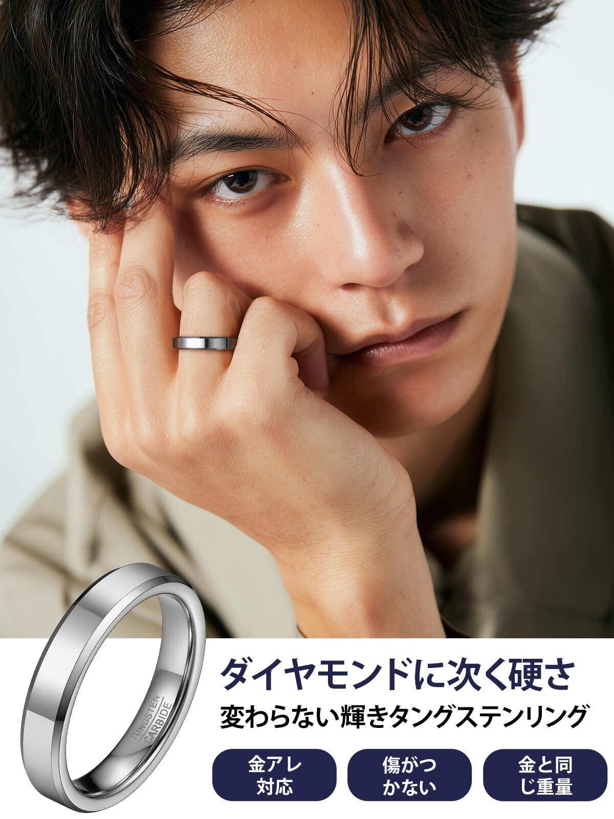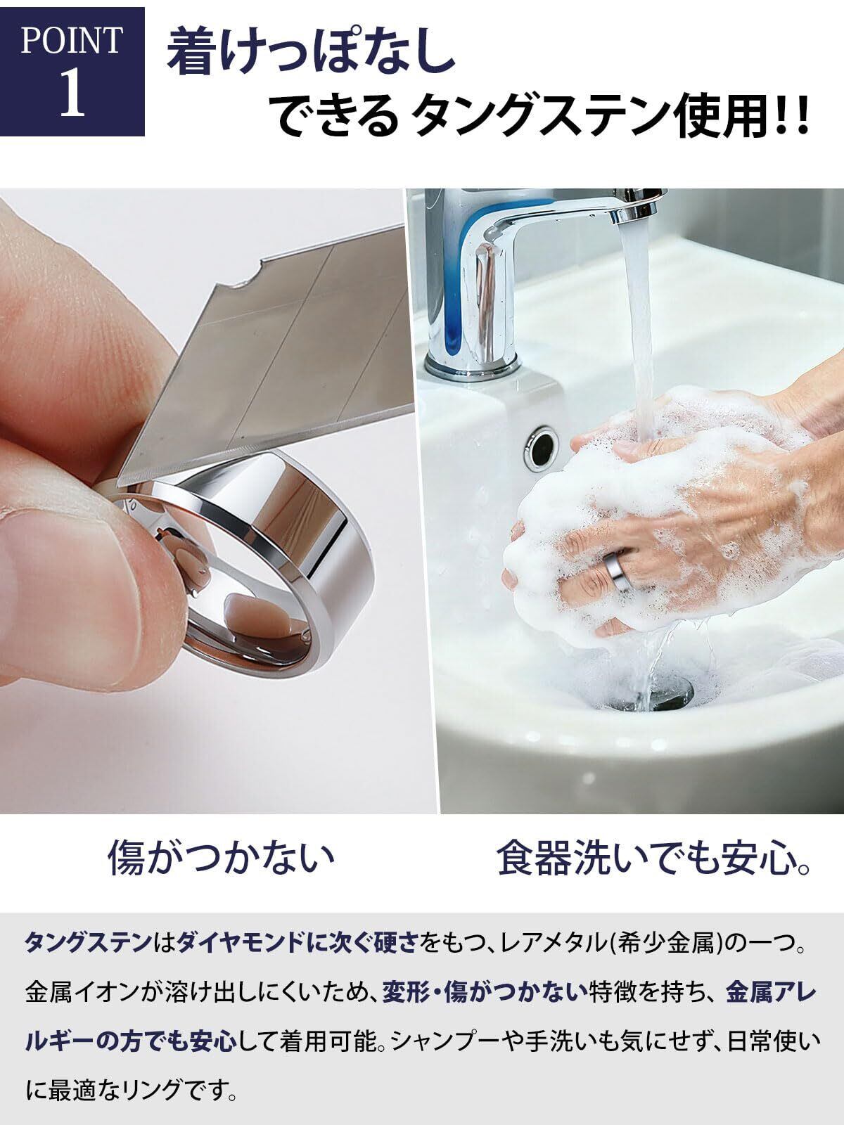 【高品質タングステン素材】ダイヤモンドに次ぐ硬さをもつタングステンを採用し、変形・傷がつきにくく、長期間美しい輝きを保ちます。また、金と同じ比重を持ち、存在感あるリングに仕上がっております。