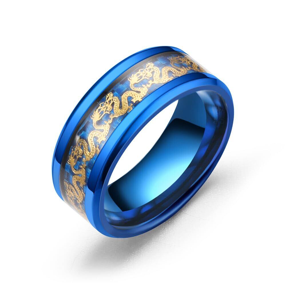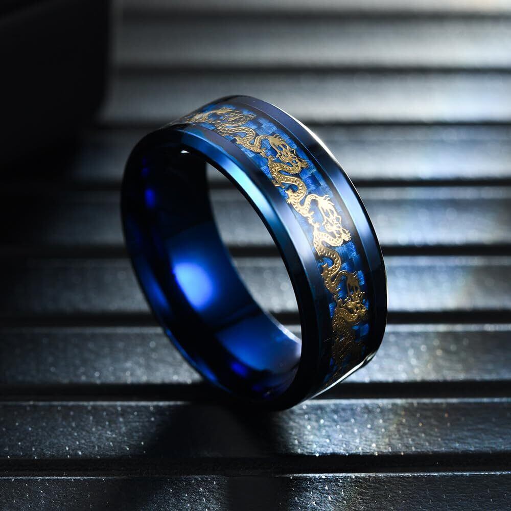 【Rockyu リング】メンズ ドラゴン指輪 ブルー&ブラック チタン製 幅8mm 中国風デザイン お守り指輪 サイズ 24号(指周り:67.5mmに合う) 金属アレルギー対応。素材: チタン 幅: 8mm。