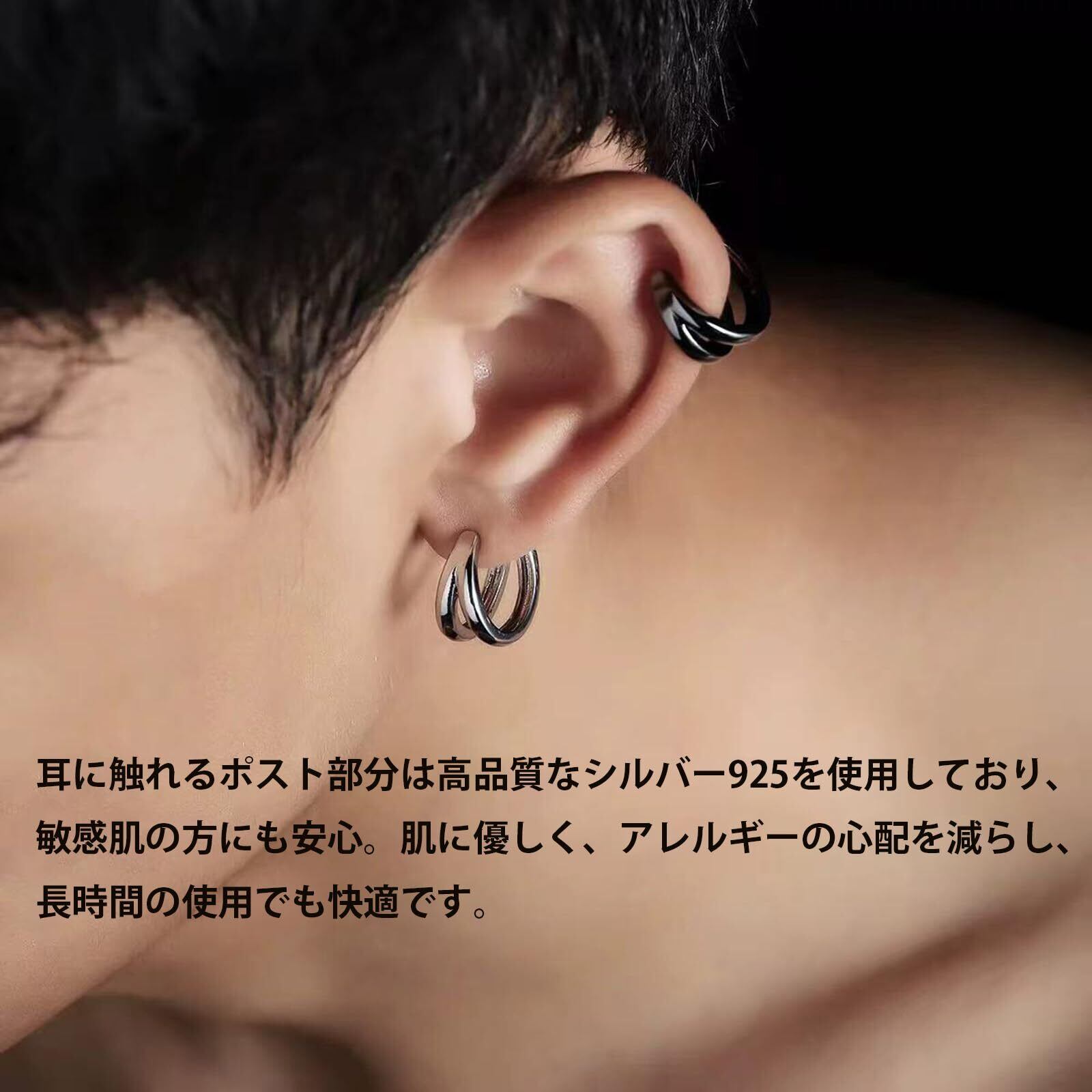 【人気商品】ピアス メンズ フープ リングピアス シルバー925 シルバー/ブラック 男性 シンプル 個性 おしゃれ 金属アレルギー アクセサリー ギフトBOX付き