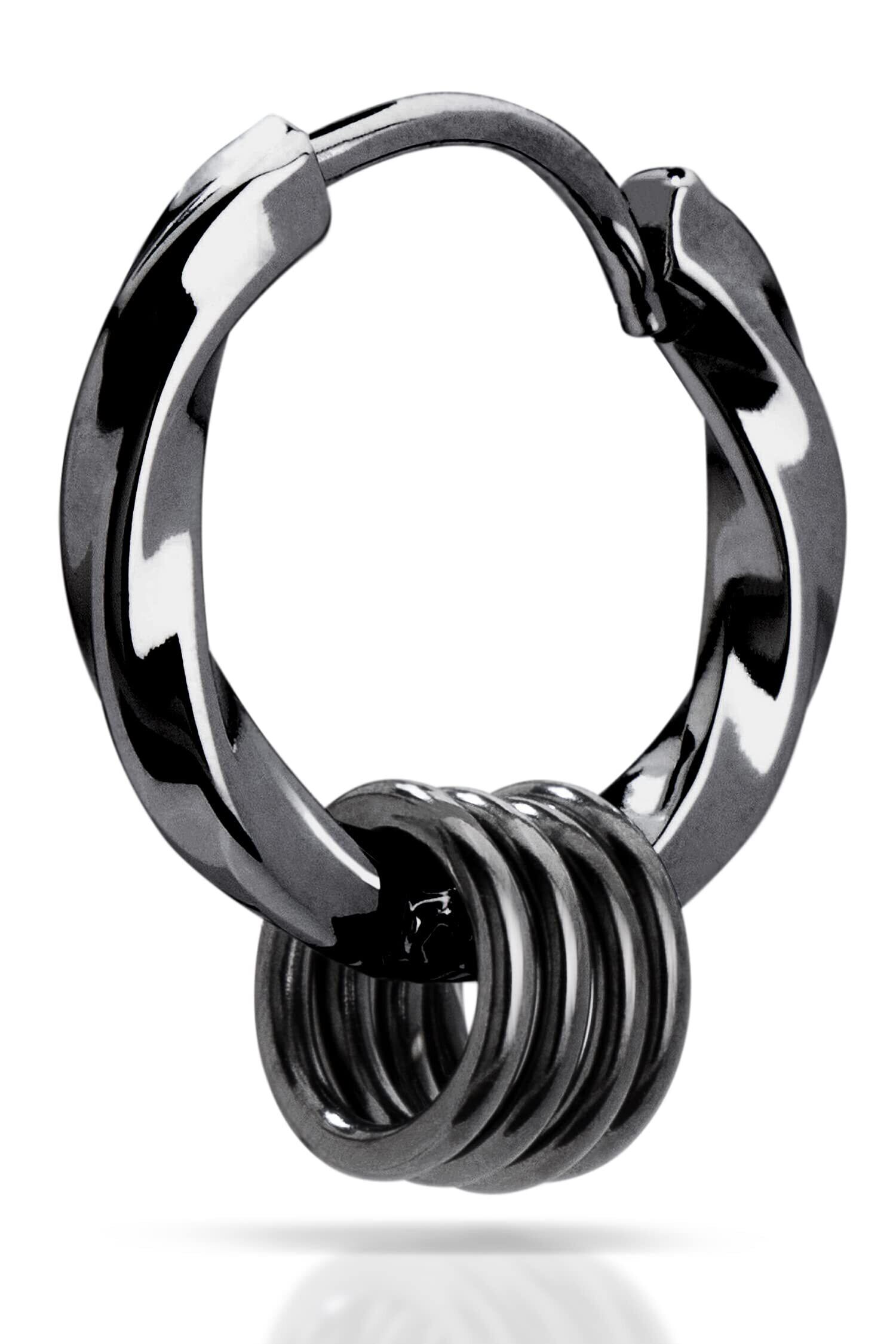 【個性が光るマルチリングデザイン】シャープ目なツイストデザインに、マットに光る黒のミニリングで個性を主張。大き過ぎないサイズ感でも、しっかり存在感のあるピアスです。