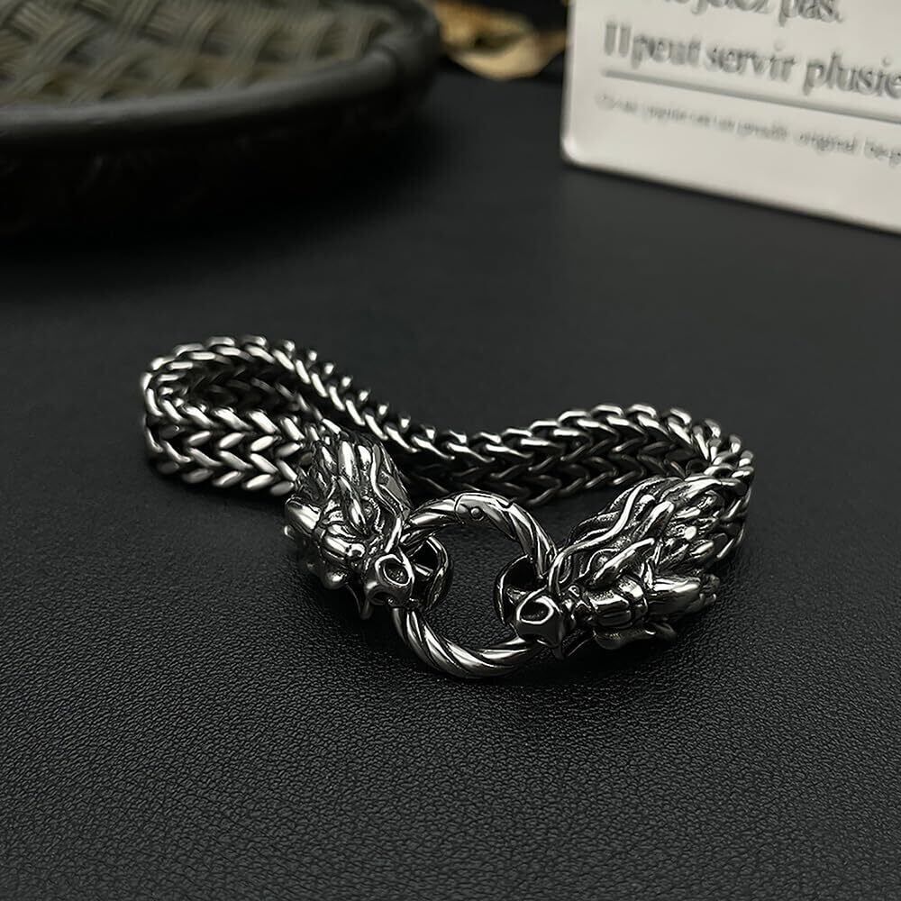 【Rockyu ブレスレット】龍頭ブレスレット メンズ チェーン 太め ステンレス製。 重厚感のあるステンレス素材を使用し、金属アレルギー対応。チェーン幅:約10mm、長さ:約220mm、重量:55g。リングでつながる龍の頭部デザインが特徴で、ヴィンテージ感あふれる仕上がり。耐久性とデザイン性を兼ね備えた逸品です。