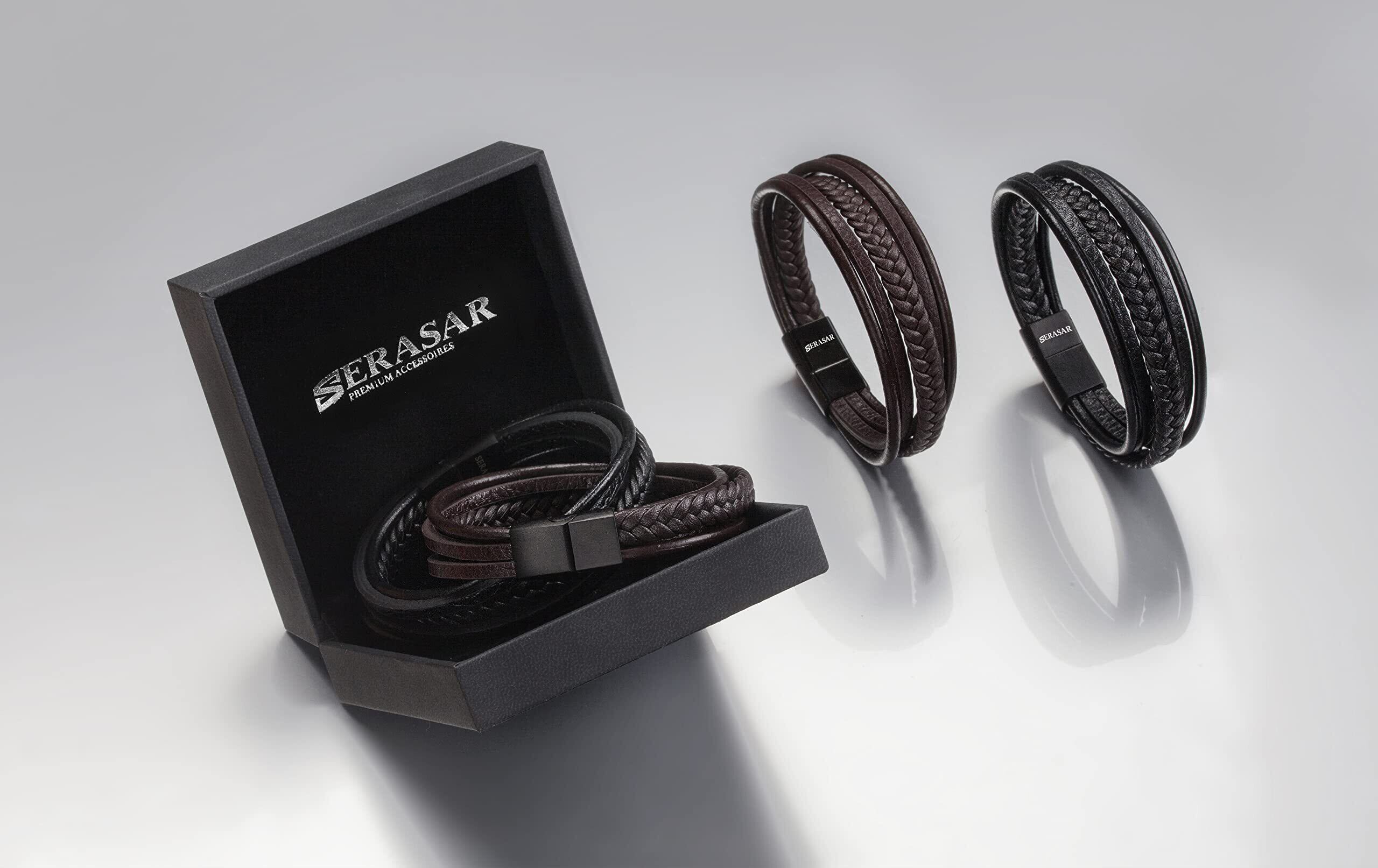 SERASAR | ブラック&ブラウンメンズプレミアム本革ブレスレット、ステンレススチールマグネットクラスプ、ジュエリーボックス付き