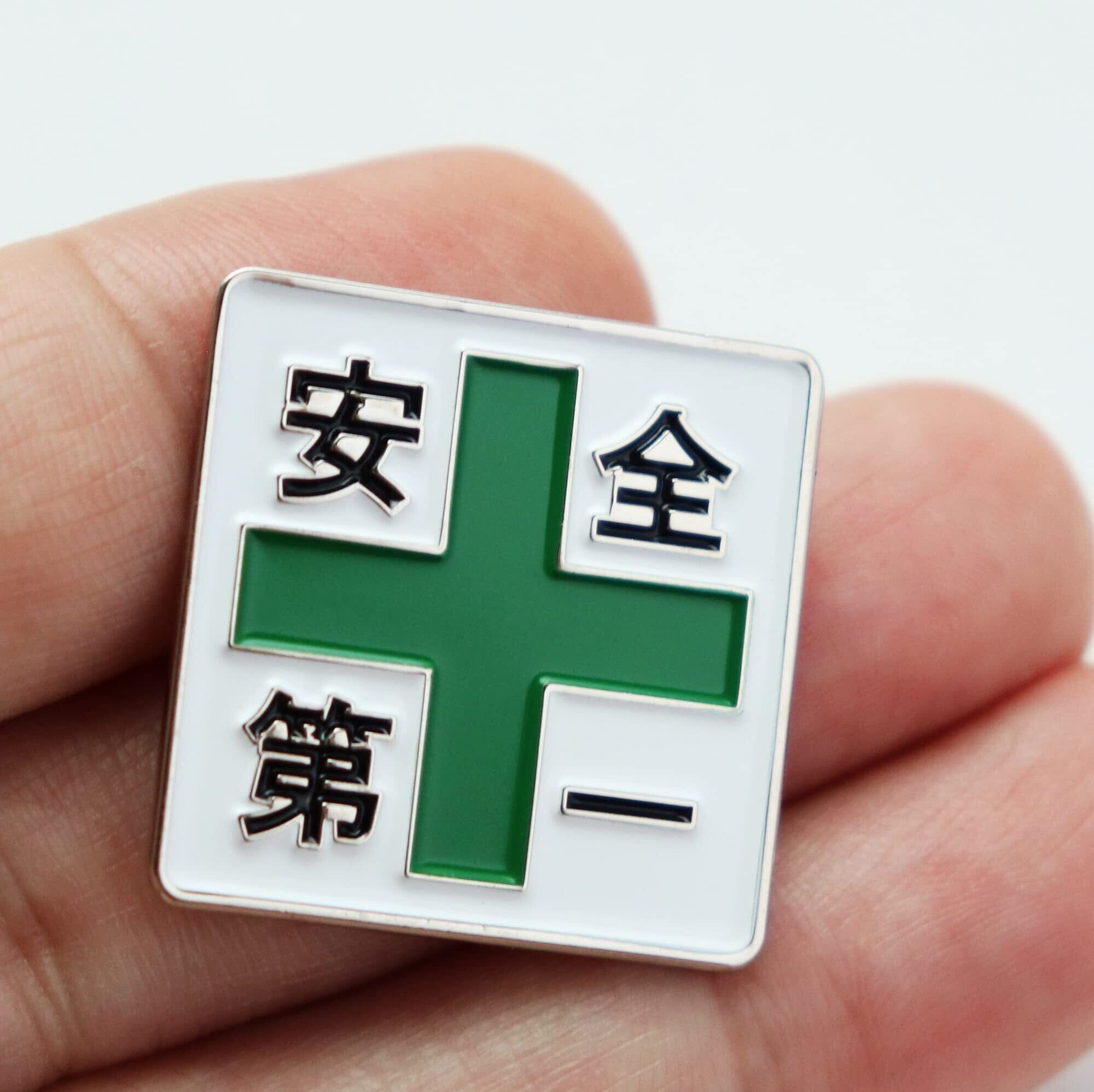 安全第一と緑十字 ピンバッジ 工場・工事現場などで働く作業員さんのためのピンズ 四角形