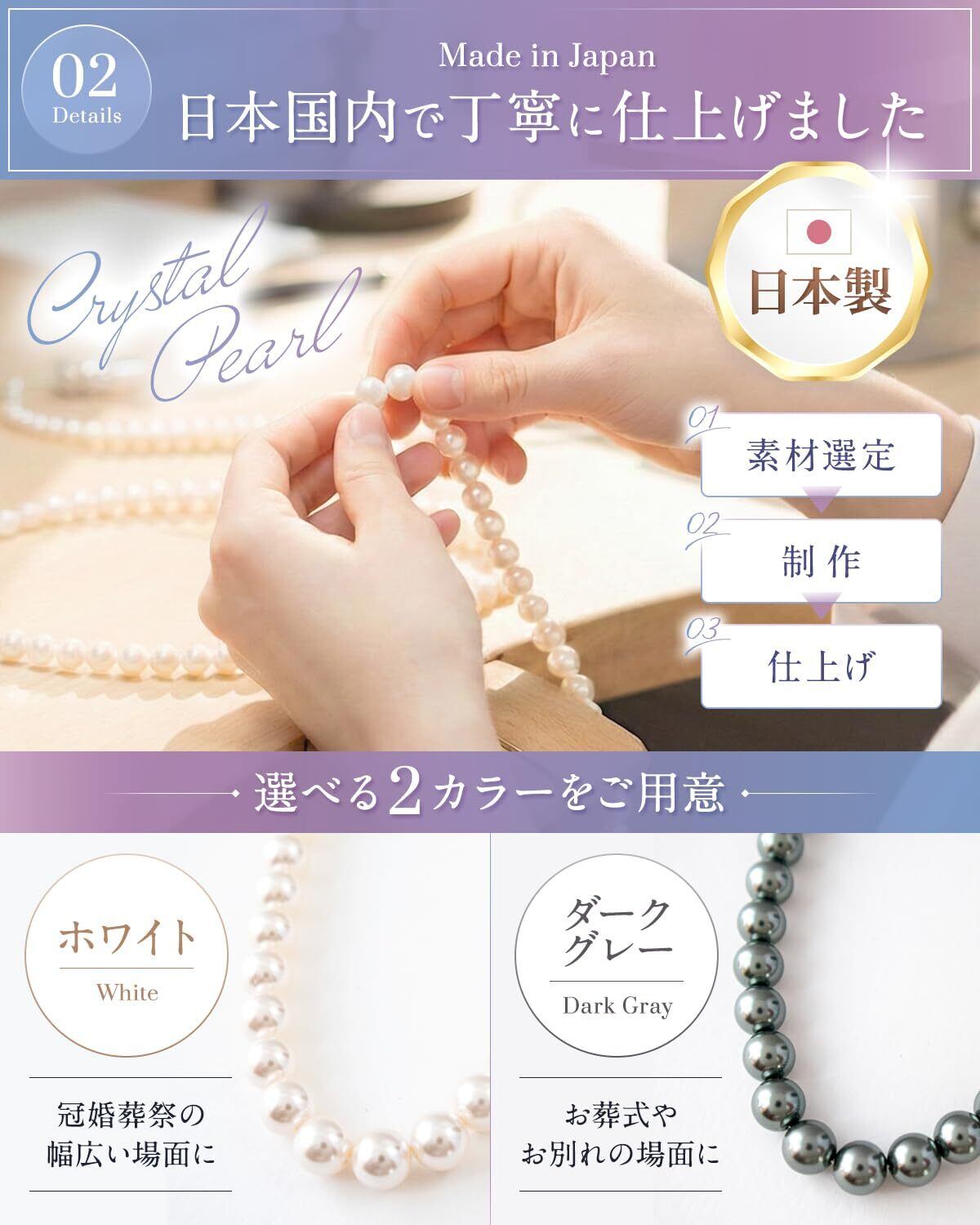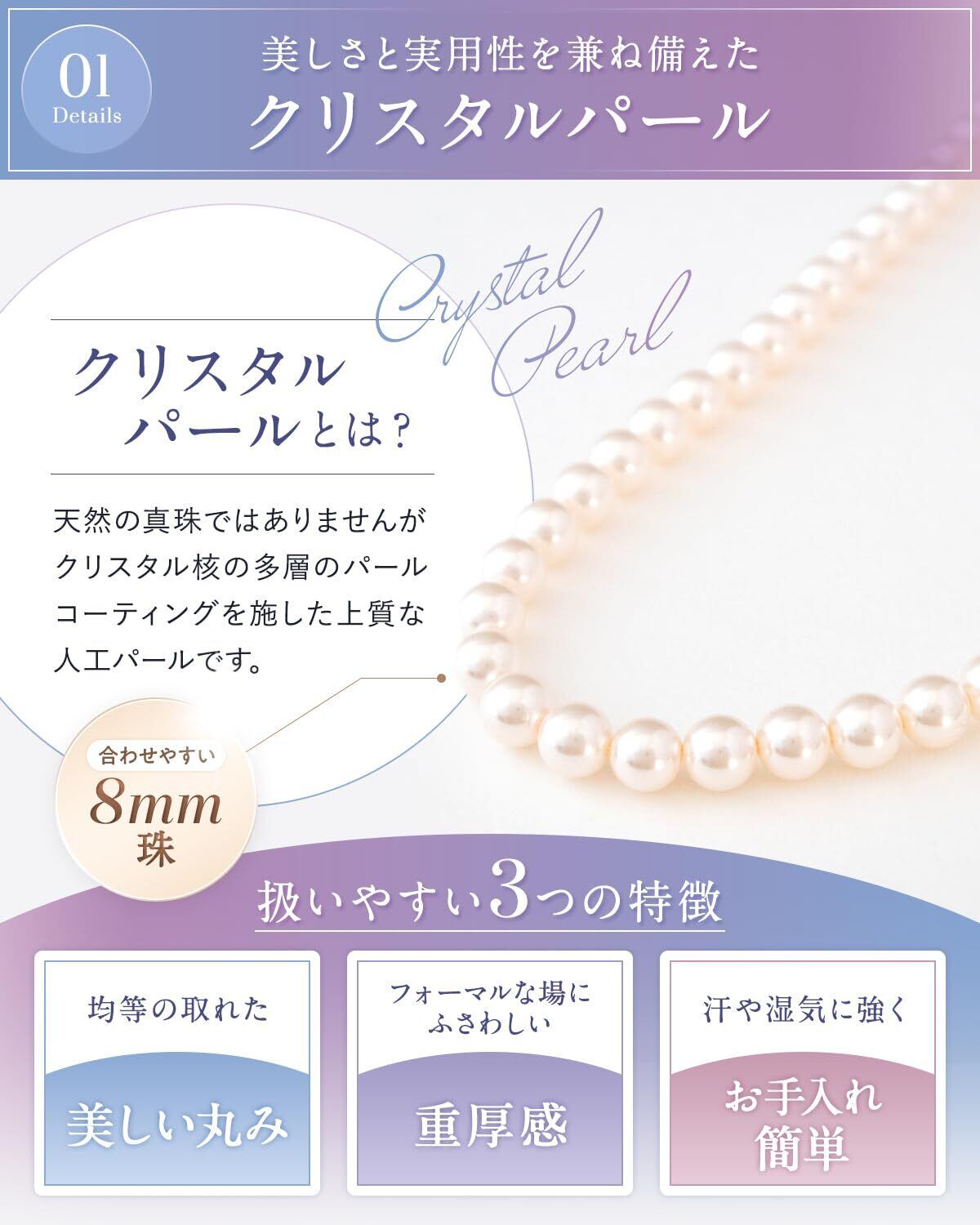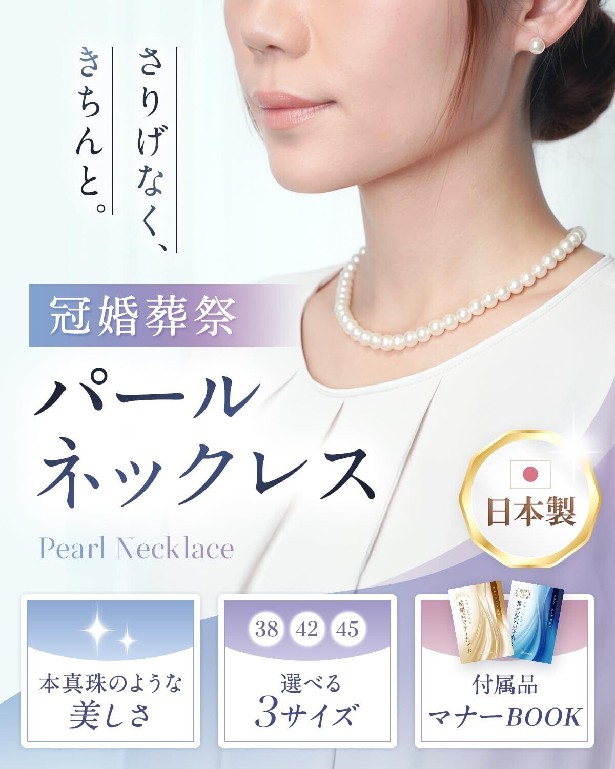 高級クリスタルパールを使用した、冠婚葬祭にふさわしい8mm珠の日本製フォーマルネックレスセット。 カラー・サイズ・ピアス/イヤリングが選べ、結婚式や葬儀、法事まで幅広く対応します。 用途に合わせたマナーBOOK付きで、大切な場面を上品に彩ります。