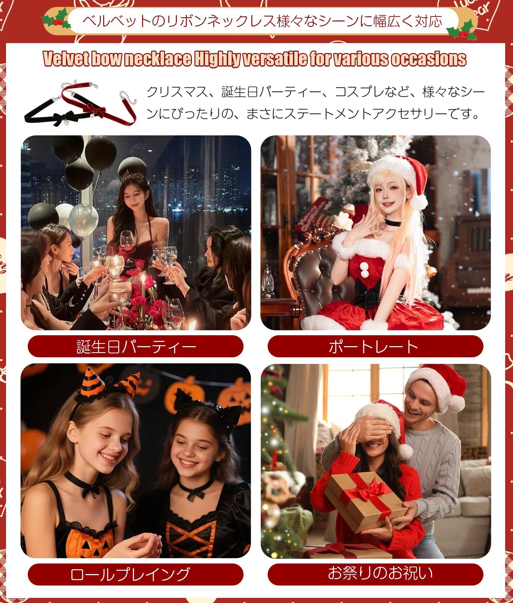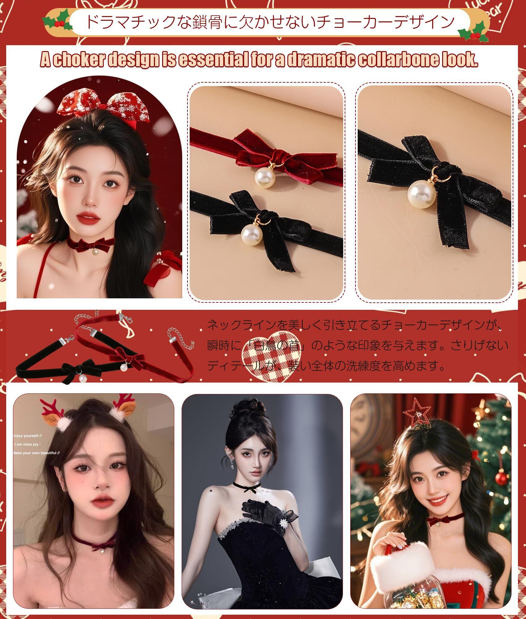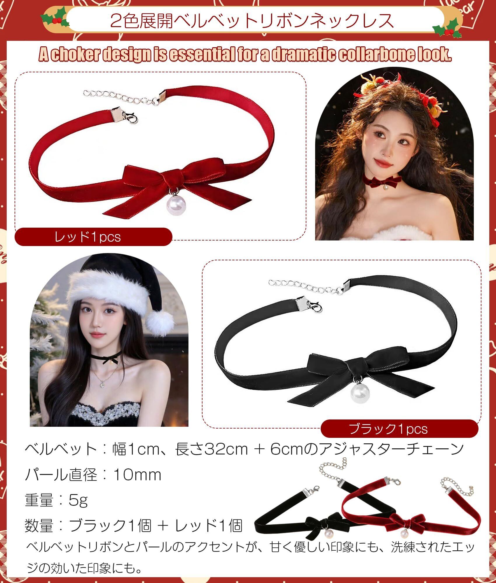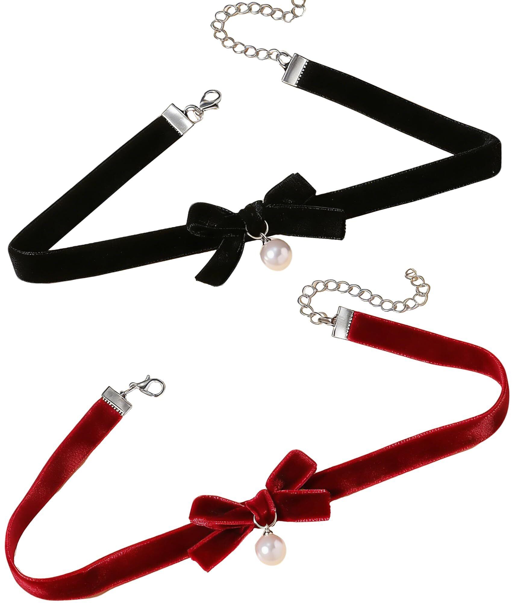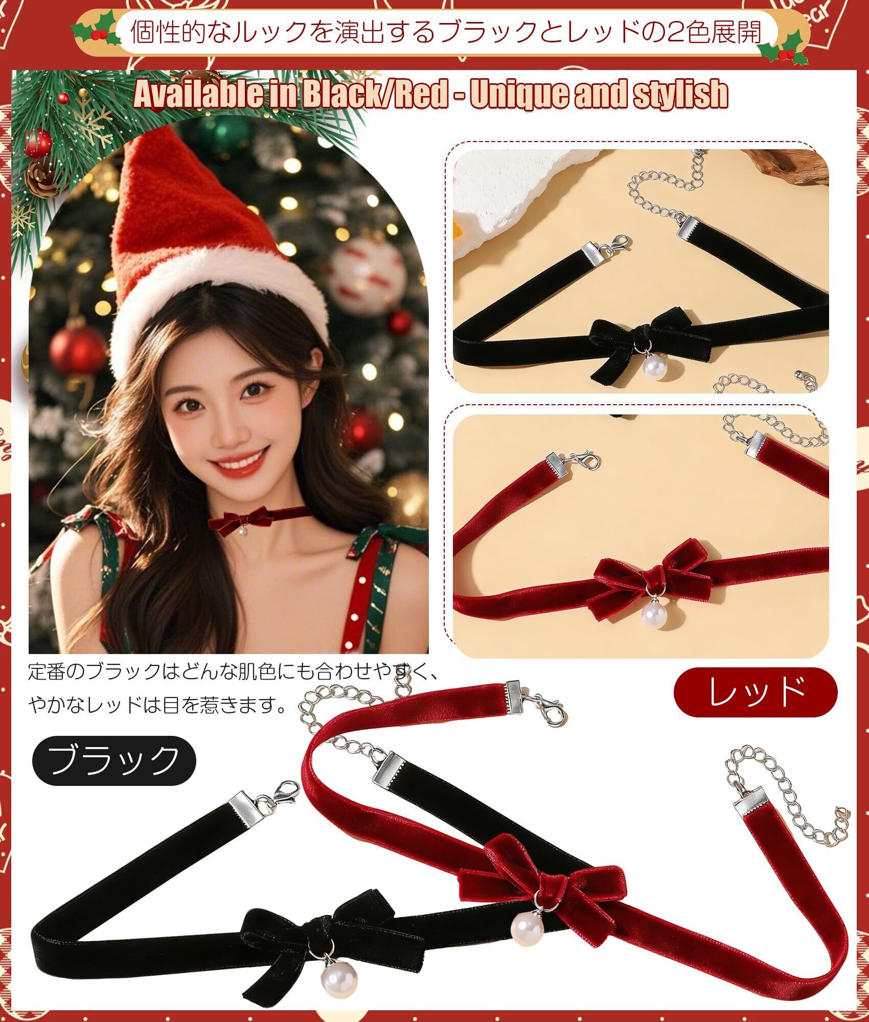 チョーカー レディース 首輪 2点セット ベルベットのリボンパールネックレス 可愛い 蝶結びチョーカー パールペンダント クリスマス/誕生日/コスプレ サブカル 見事な外観のための必需品 個性的なスタイルにマッチ 調節可能(ブラック1点 + レッド1点)