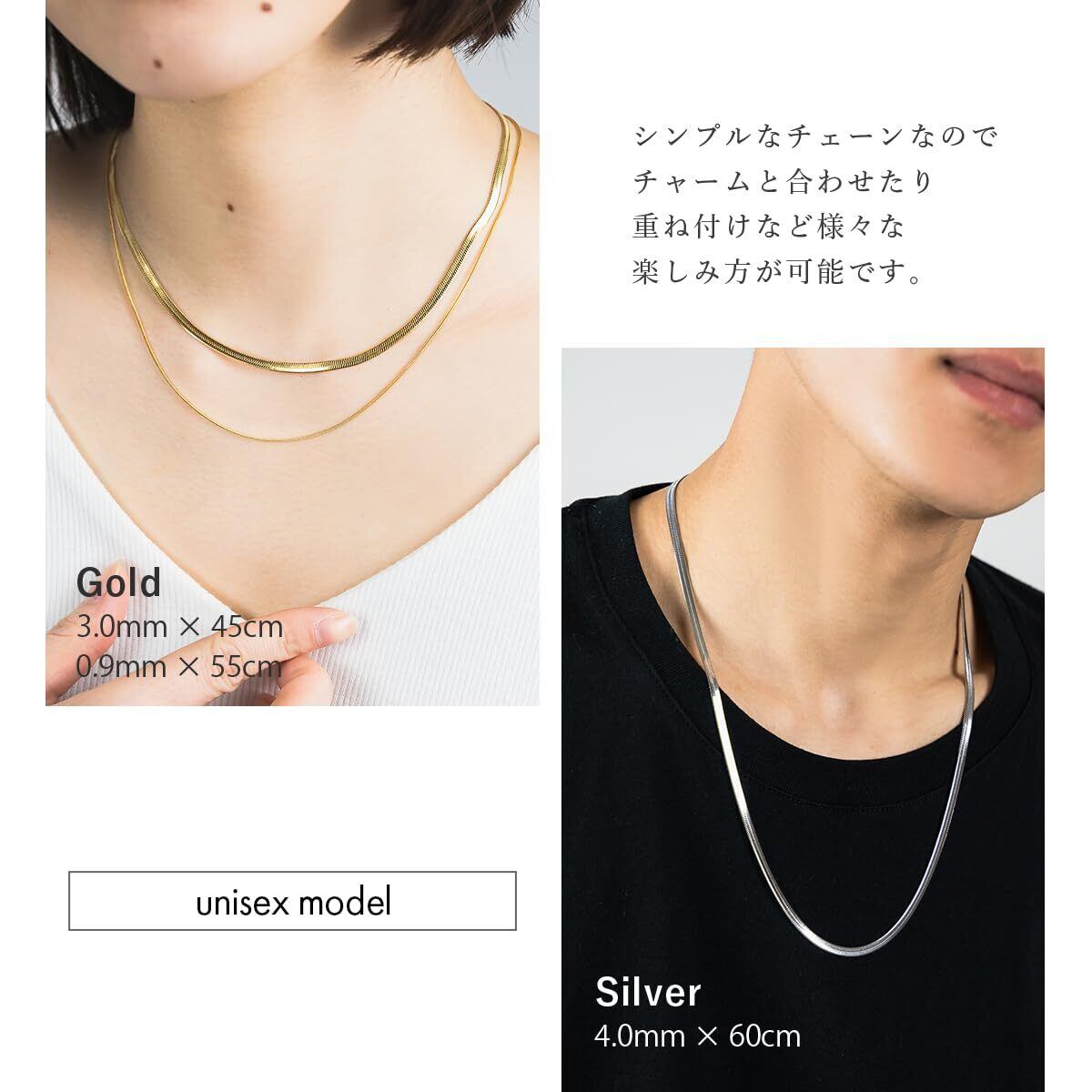 【バリエーション豊富】チェーン幅が2mm,3mm,4mmの3種類、チェーンの長さが40cm,50cm,60cm、カラーがシルバー、ゴールドの2色の計18種類からお選びいただけますので貴方のお気に入りがきっと見つかります。シンプルに着用したり、2,3本重ねて着けたりお手持ちのチャームなどと合わせてみたりとお好みのスタイルでお楽しみいただけます。