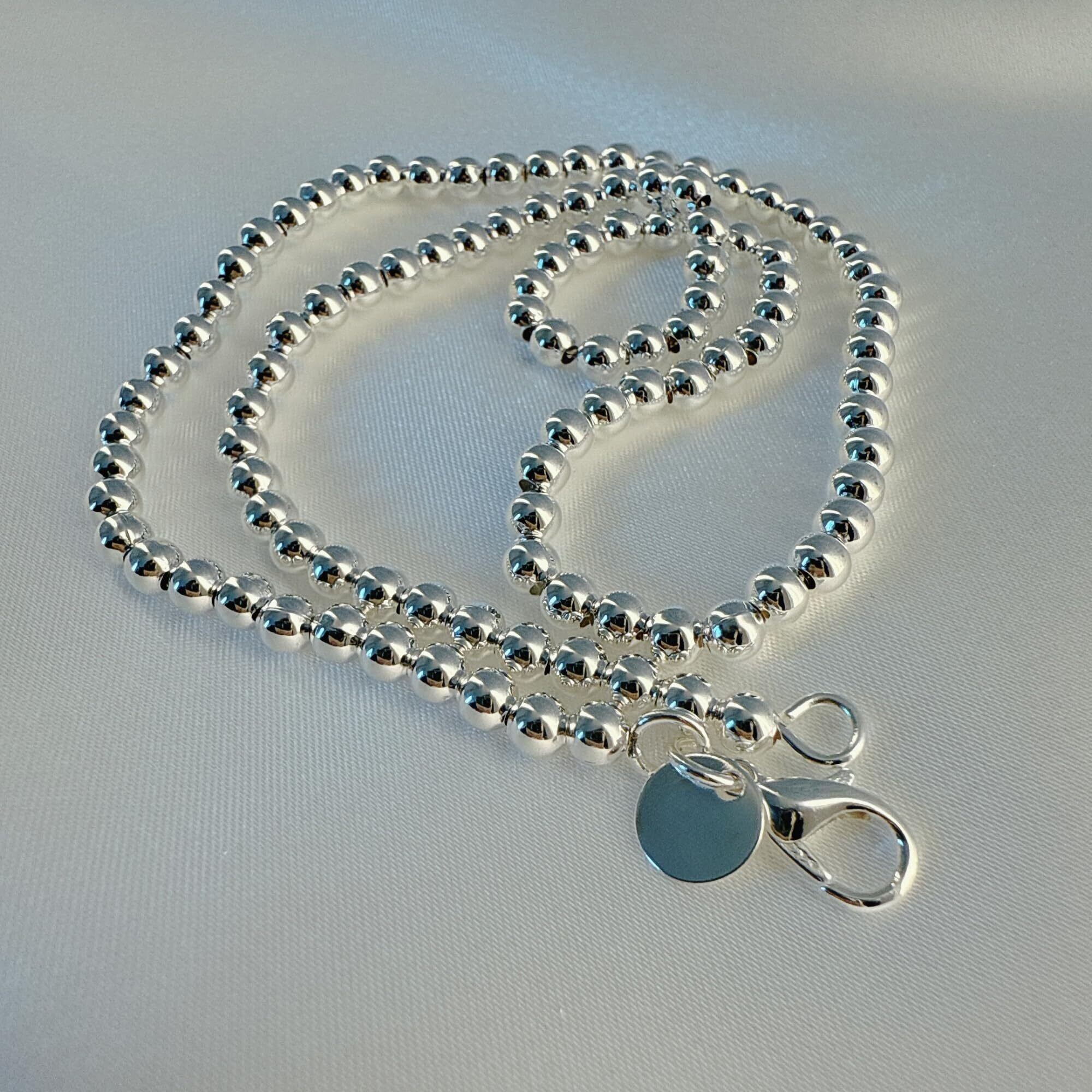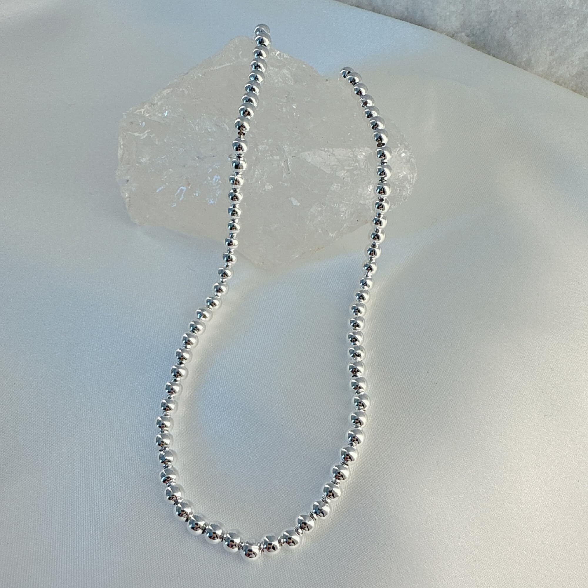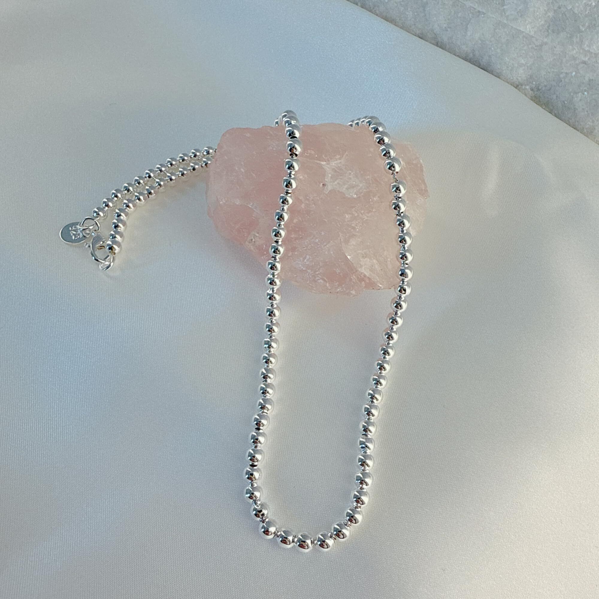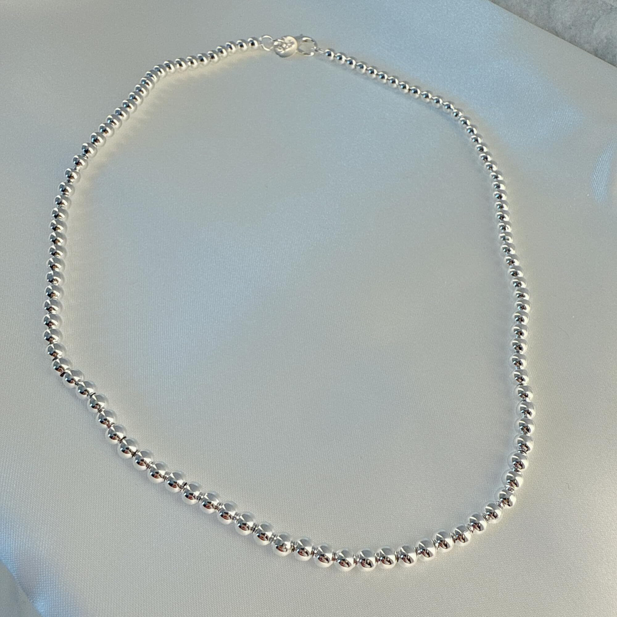本商品は存在感のある4mm幅。連なるボールが光を反射し、動くたびにきらめきます。