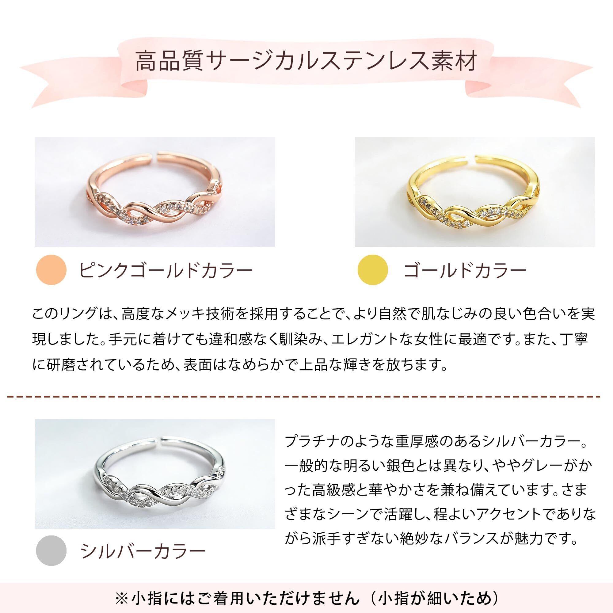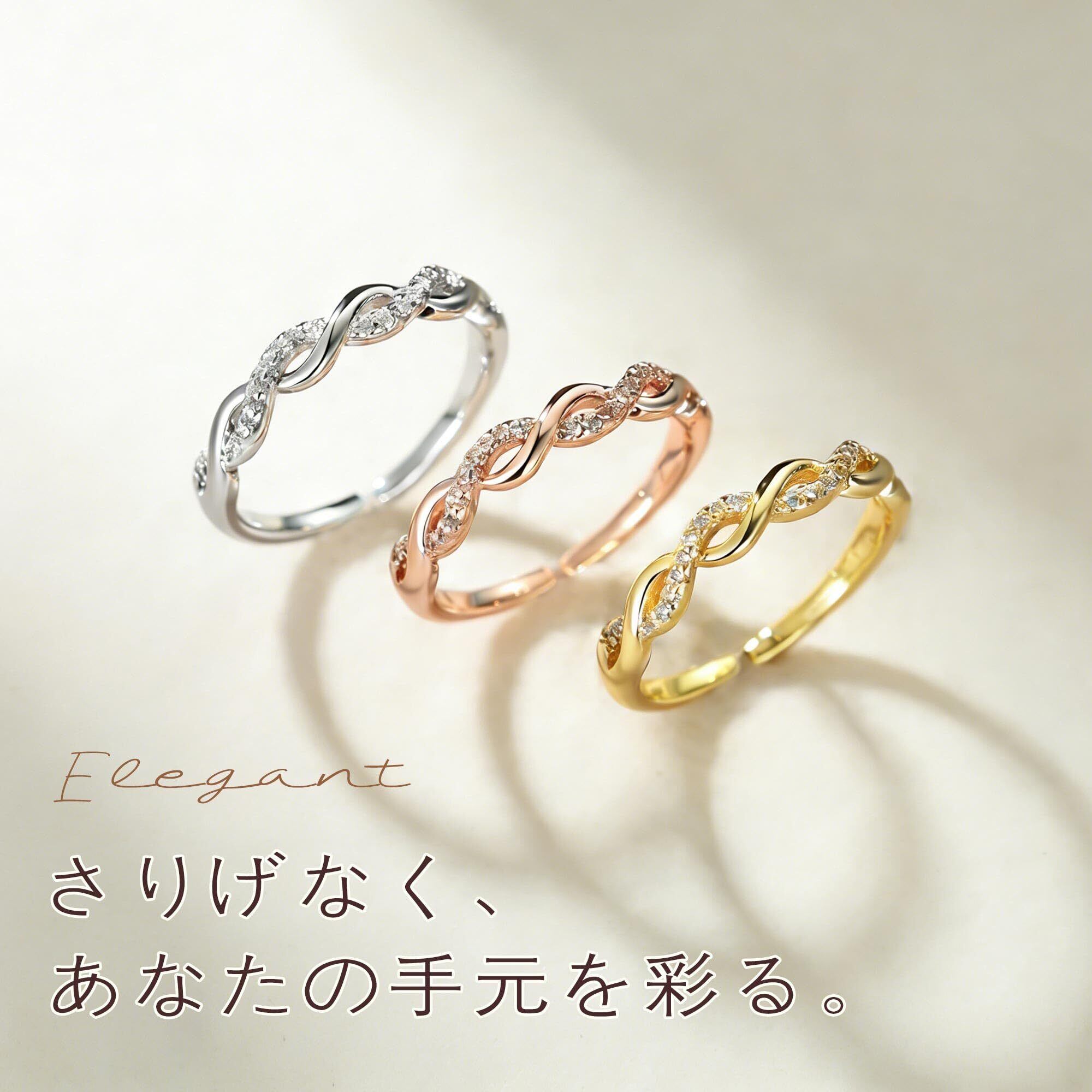 【人気のデザイン】:指輪には優美に絡み合う曲線と、きらめくジルコニアをあしらいました。上品さと可愛らしさの絶妙なバランスが魅力のデザインです。ファッションセンスと個性を大切にする、そんなこだわりの女性にこそぴったりです。主張しすぎない控えめな存在感で、派手になりすぎずにさりげなくあなたの魅力を引き立てます。普段のカジュアルから特別な日のドレスアップまで、多様なスタイルに自然に溶け込みます。どんなシーンでもさりげなくおしゃれを引き立て、個性を優しく強調してくれます