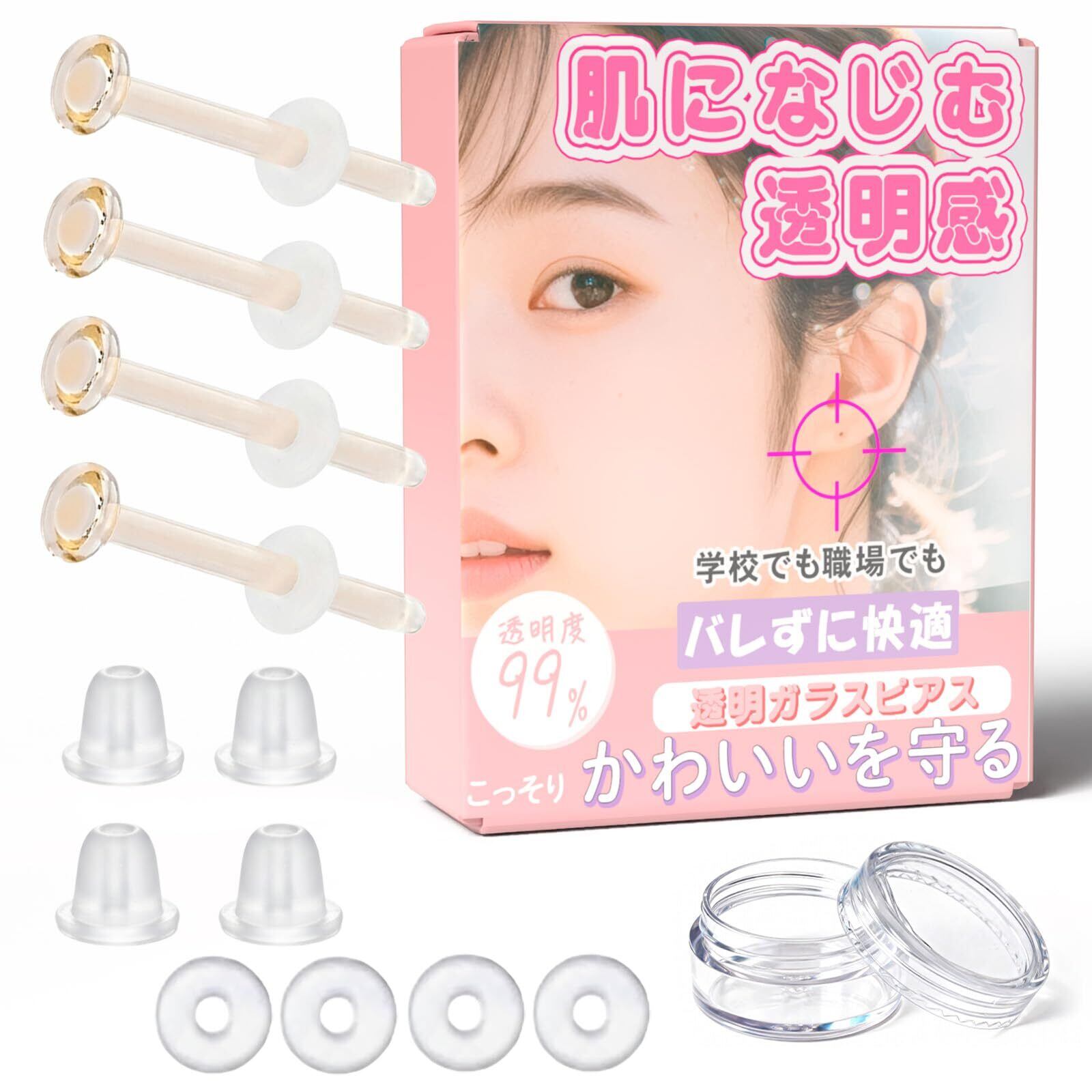 【新着商品】透明ピアス ガラス 金属アレルギー対応 つけっぱなし 4本セット キャッチ8個付き 肌になじむ ファーストピアス 収納ケース付き
