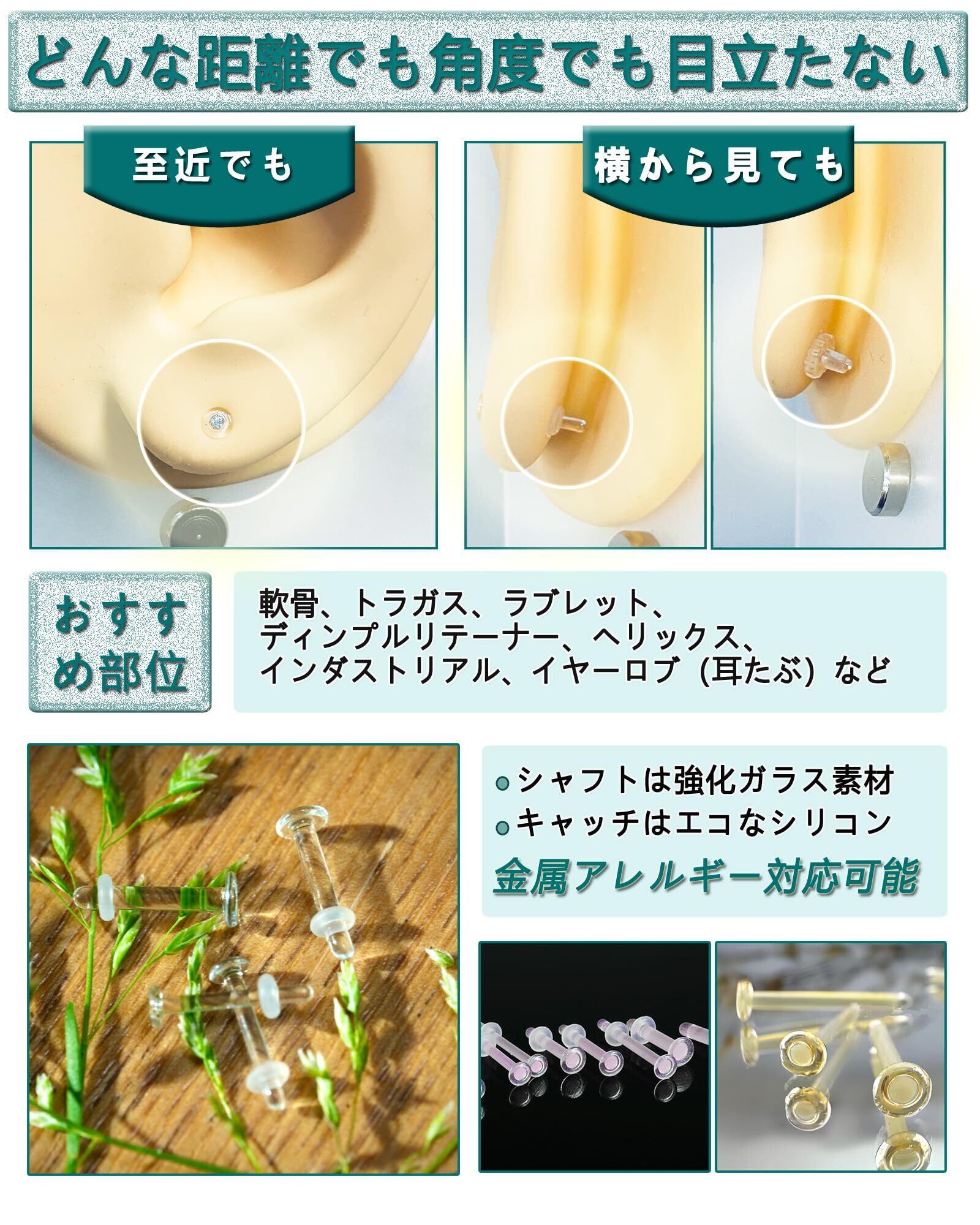 【透明度が高いから目立たせない】ガラスピアスは割れにくく、熱に強く、また透明度も高いため目立ちにくい耐熱強化ガラスを採用し、強化ガラスにしか出せない圧倒的な透明度でお肌に自然と馴染んで、アクリルよりも透明度が高く、まるで付けていないような使用感です。先が丸く丈夫な作りのため装着時もつけっぱなしでも安心。ファーストピアスや長期着用ピアスとしてはもちろん、アンテナヘリックスのホールをを隠したい、透ピで付けっ放し、隠さないといけない仕事や学校でも目立たずにしっかりホールキープ!