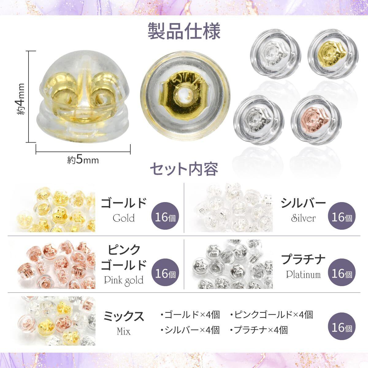 【セット内容】シリコン製ピアスキャッチャー×16個(8ペア) 【サイズ(約)】4mm×5mm×5mm 【材質】高品質シリコン・金属 【カラー】ゴールド・ピンクゴールド・シルバー・プラチナ・ミックス(ゴールド・ピンクゴールド・シルバー・プラチナ各4個) ※お好みのバリエーションをお選びいただけます。