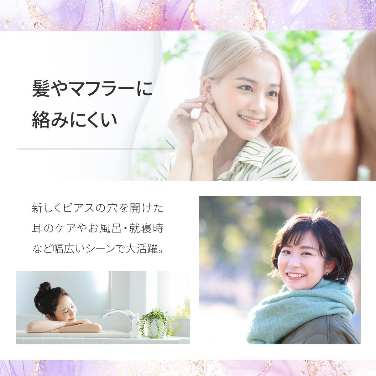 お気に入りのピアスをしっかり留めて万が一の紛失を防ぎます。髪やマフラーに絡みにくく、お風呂・就寝時・新しく穴を開けた耳のケアなど幅広いシーンで大活躍します。装着時でも違和感のない丸形に仕上げました。
