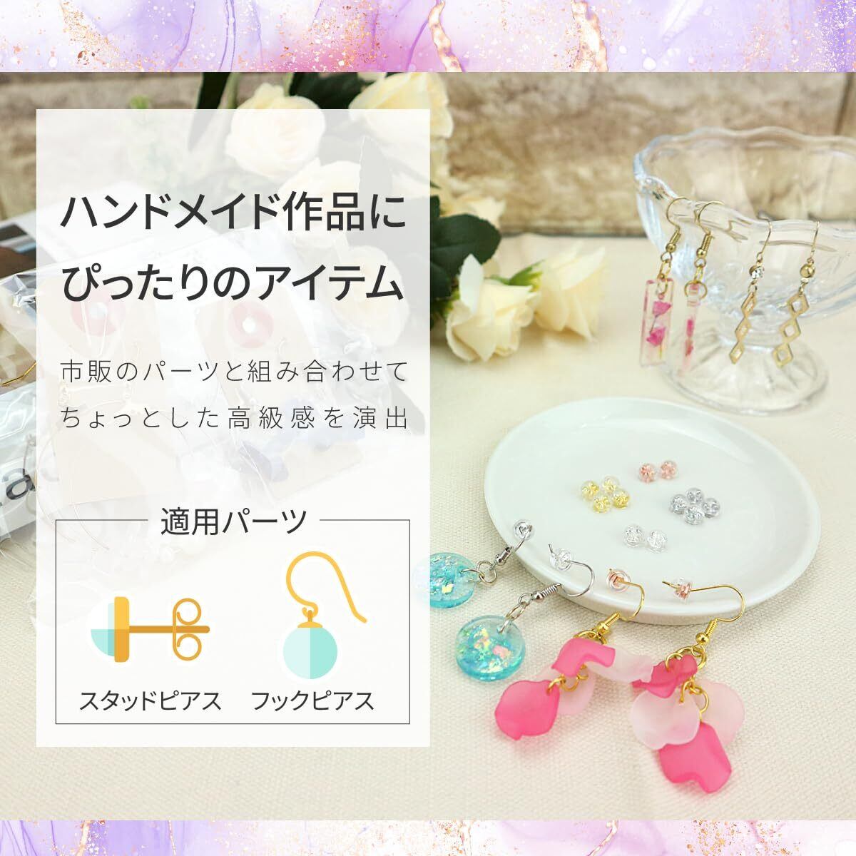 市販のパーツと組み合わせるだけでちょっとした高級感を演出します。スタッドピアスはもちろん、留め具が付属しないフックピアスにも適用できるため、ハンドメイド作品のクオリティアップにぴったりのアイテムです。