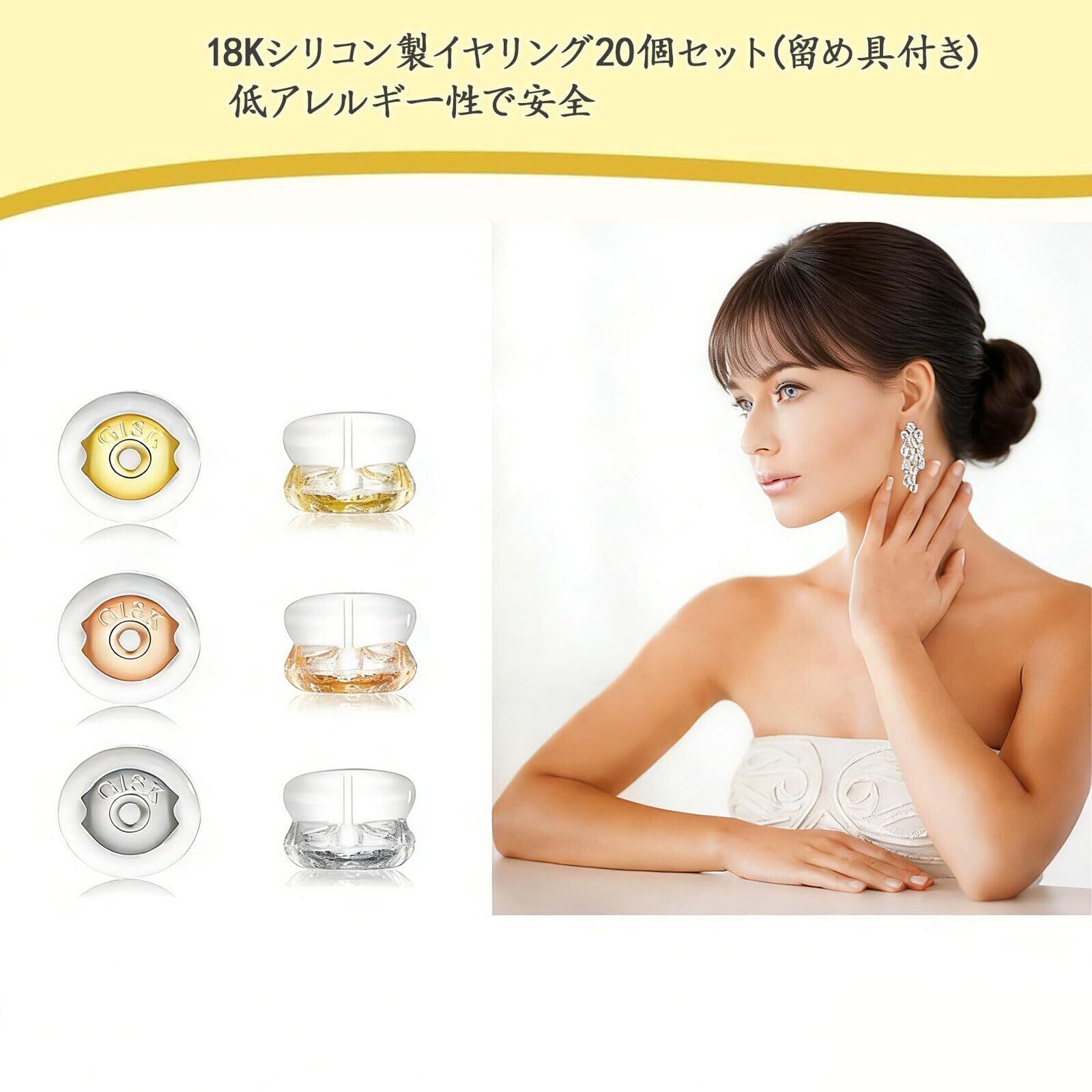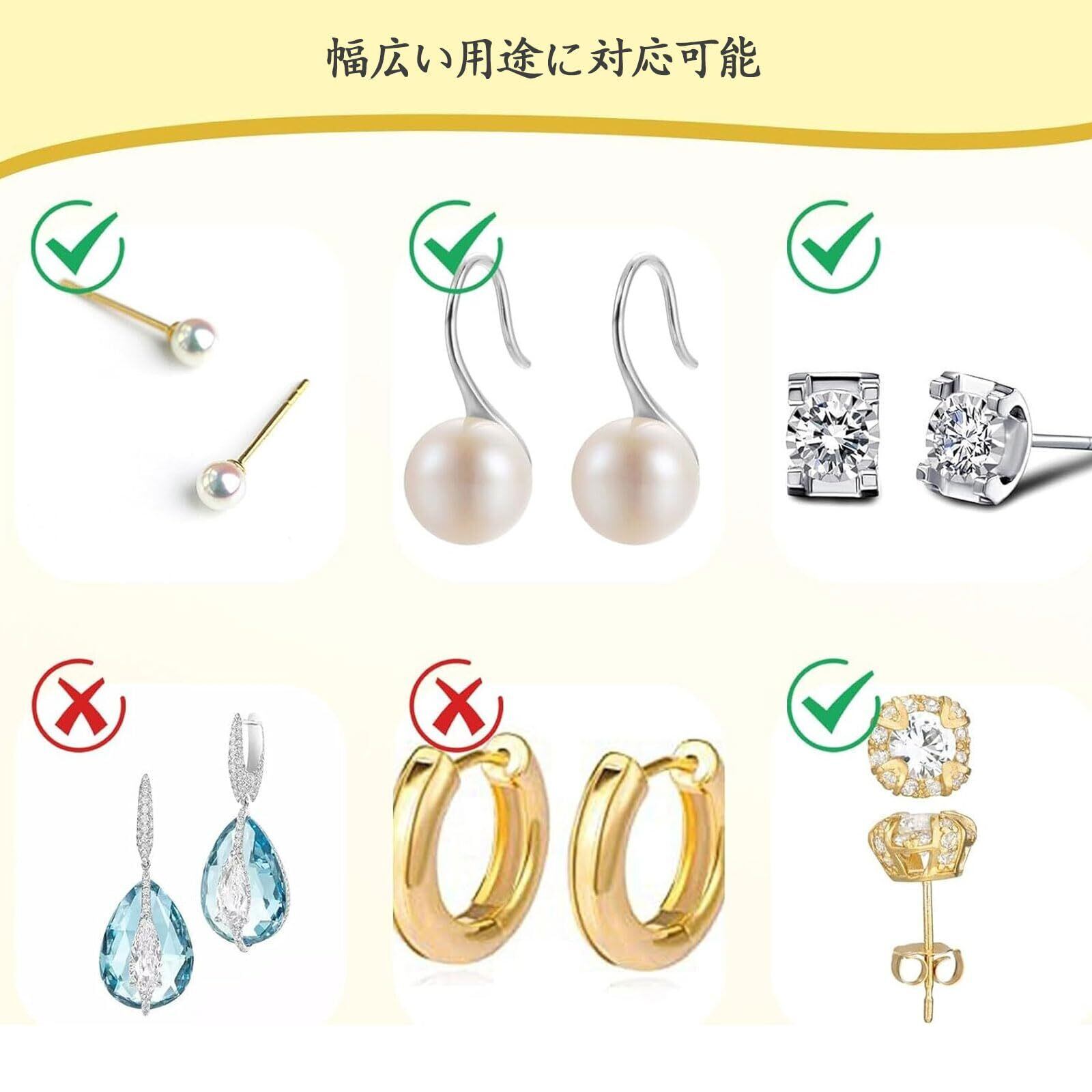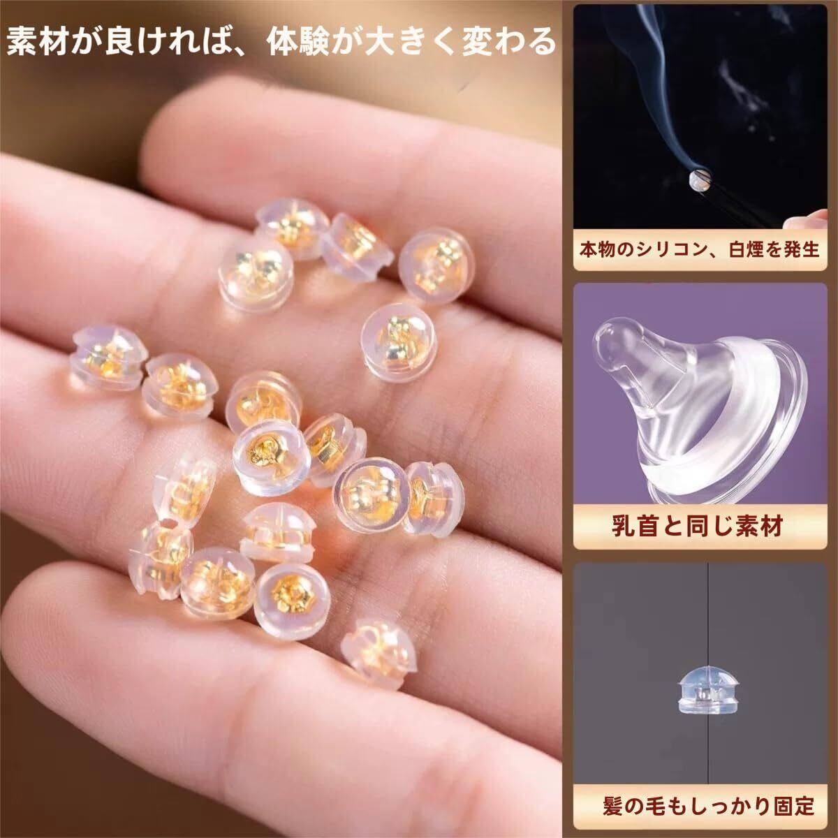 【メッキ 金属アレルギー対応】18Kゴールドメッキのシルバーメタル製イヤリングキャッチと柔らかく透明なシリコン素材で作られており、柔軟で快適な着け心地です。ニッケル、鉛不使用で、肌に刺激を与えません。このシリコン製イヤリングキャッチは、スタッドピアス、フープピアス、ドロップピアスなど、ほぼすべてのタイプのピアスにご使用いただけます。