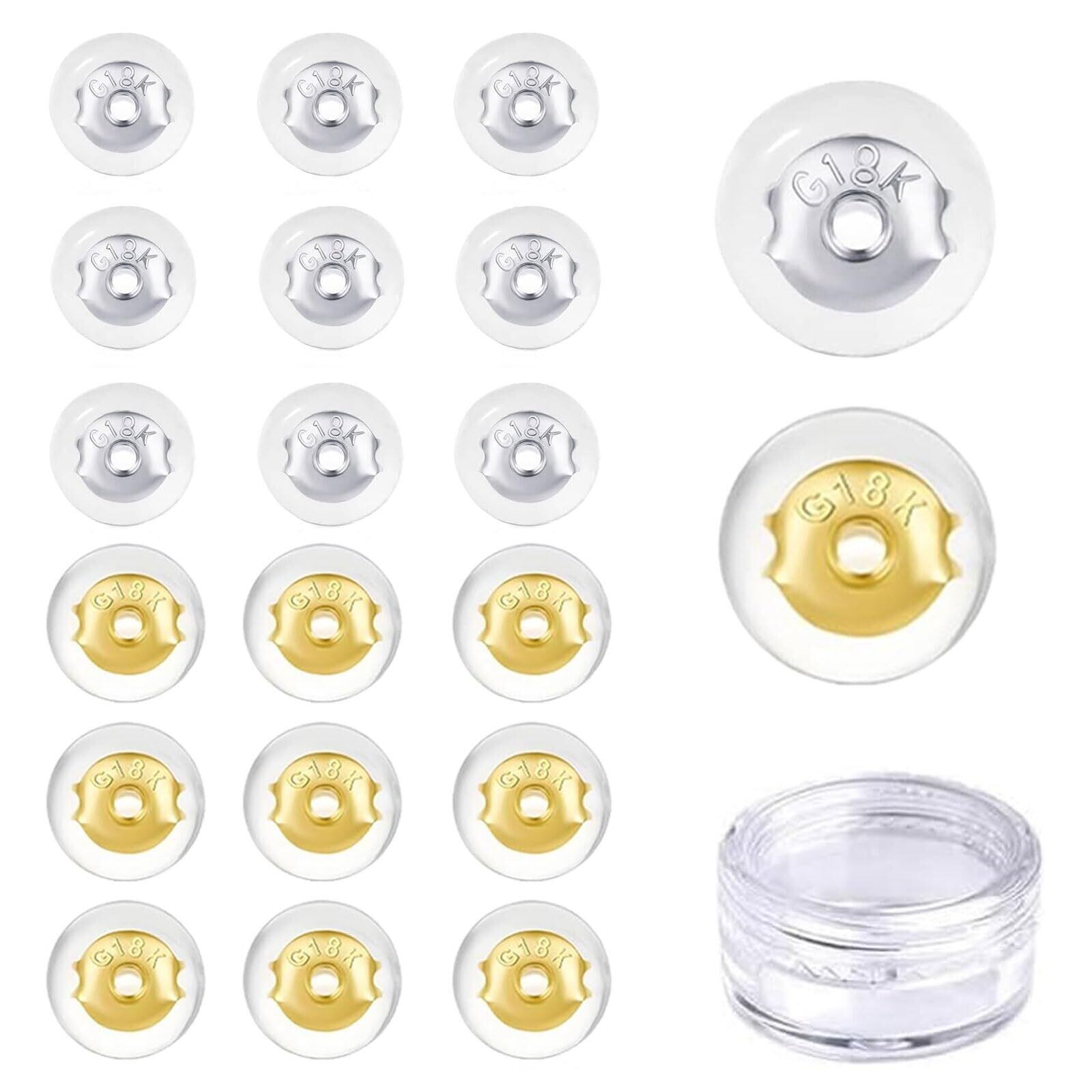 ピアス キャッチ シリコンメッキ 落ちない 取れない/落ち 10ペア(20個)セット K18 透明収納ボックス付き ユニセックス (ゴールド×10個 + シルバー×10個)