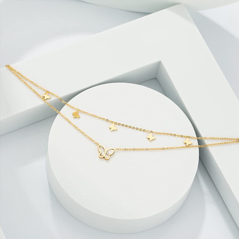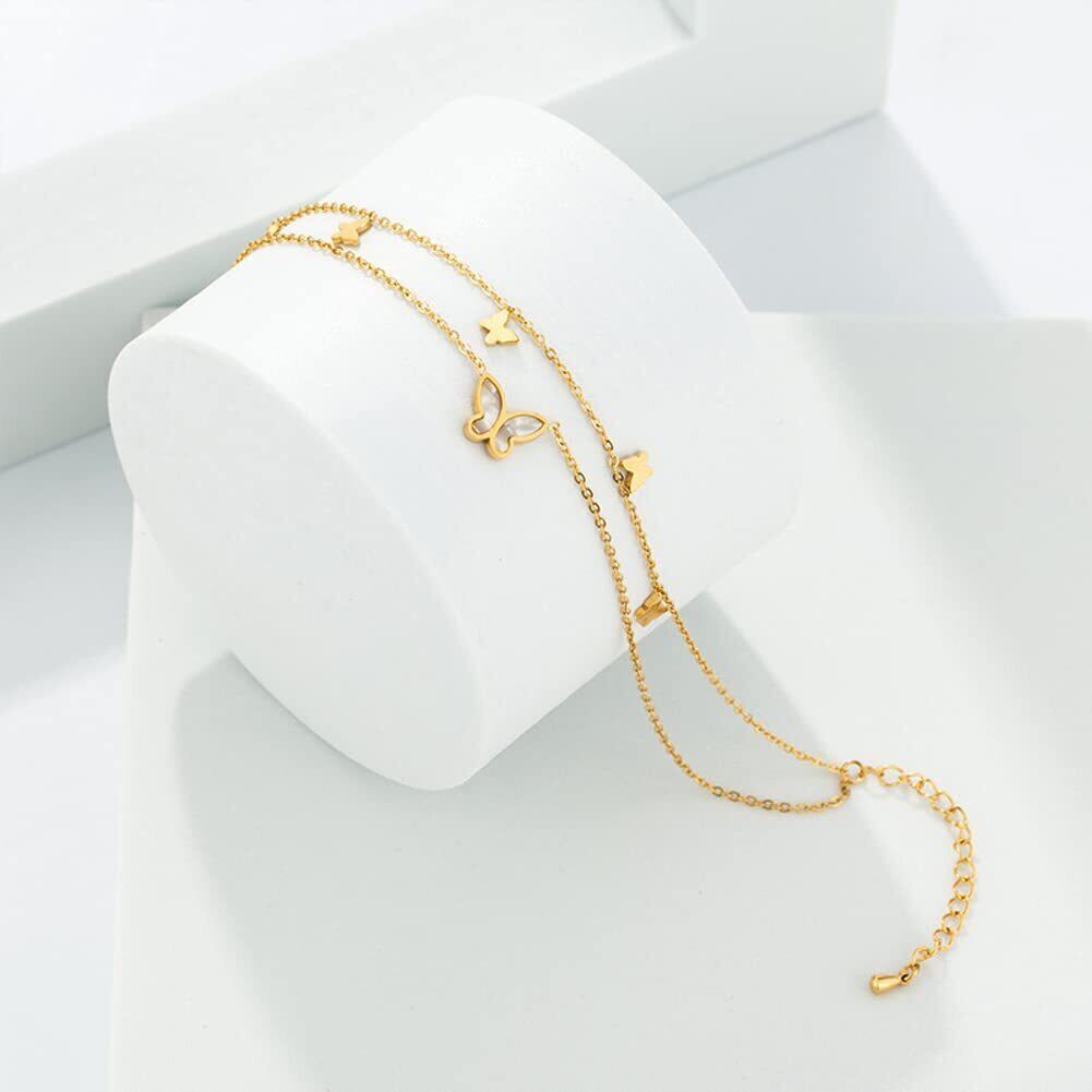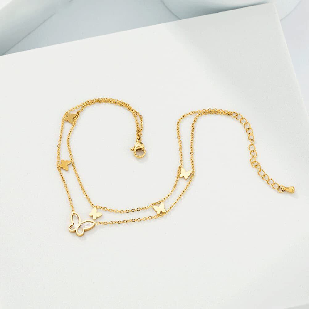 【Deelfel アンクレット】蝶々モチーフ 二連チェーン おしゃれ レディース 日常使い 誕生日プレゼント 材質: 合金、長さ: 23+5cm(調整可能)
