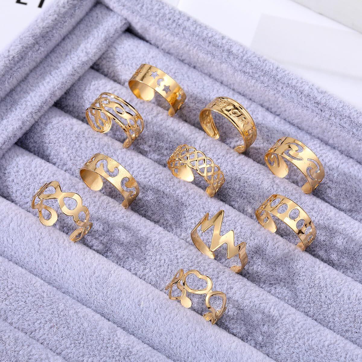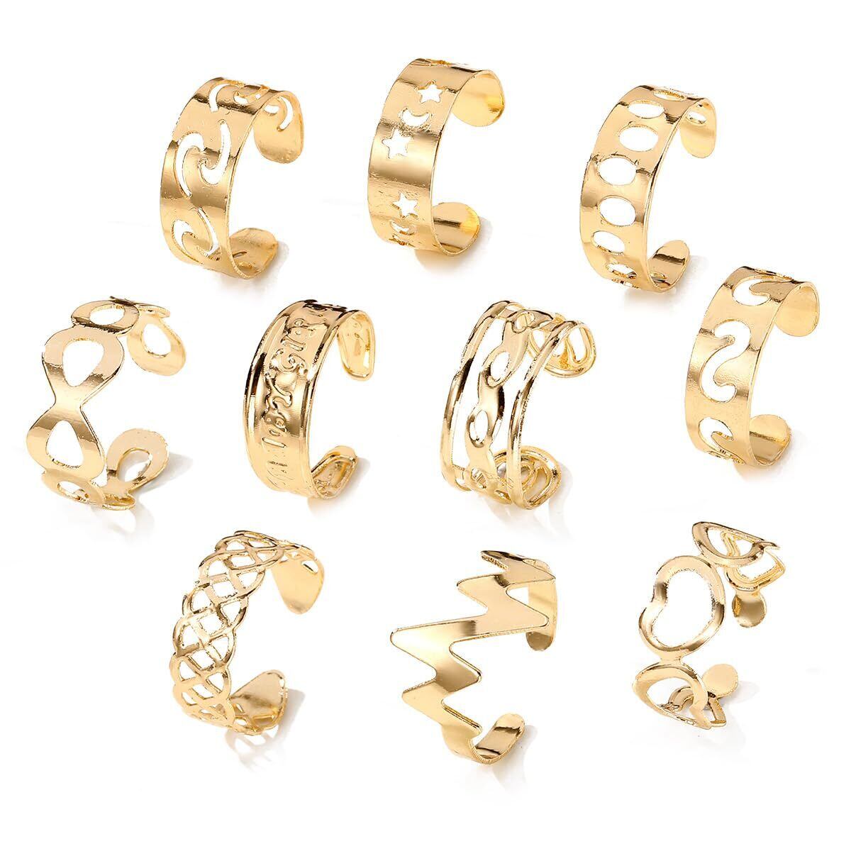 【2022最新】トゥリング レディース ゴールド シルバー フリーサイズ 波型モチーフ 星形 稲妻風 8字デザイン入り リング 10点セット 合金 軽量 調整可能 ビーチ リゾート向け