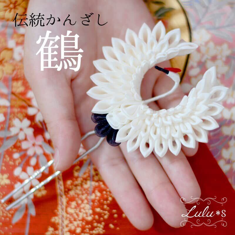 Lulu's ルルズ つまみ細工 鶴丸かんざし ヘッドドレス 結婚式 成人式 卒業式 前撮り サイズ:羽根を広げて7.5cmかんざし7cm つまみ細工 鶴丸 Lulu's-2467