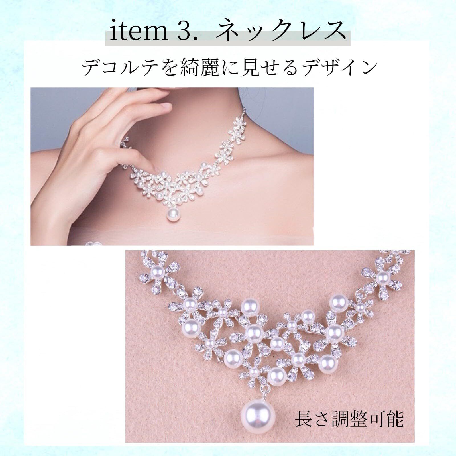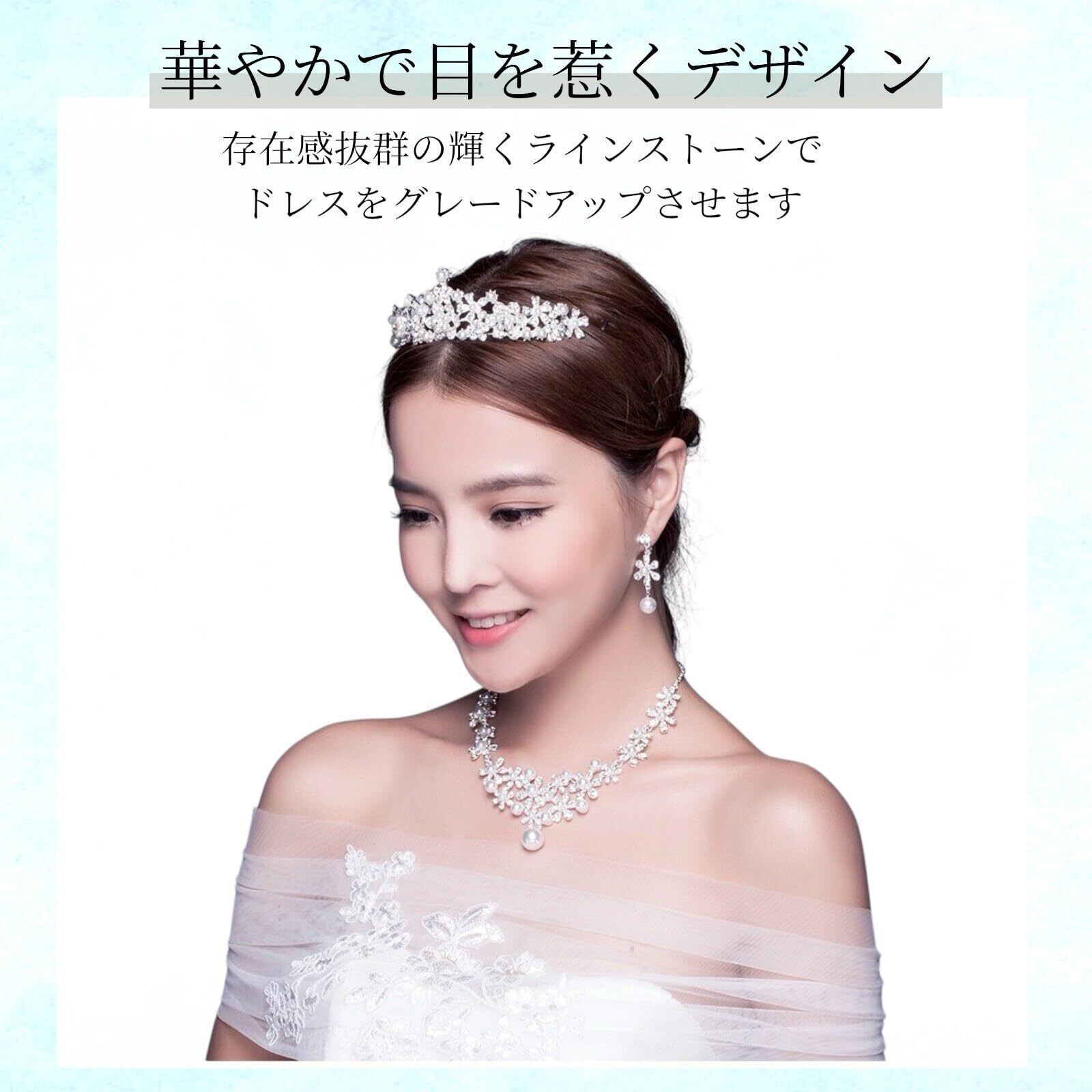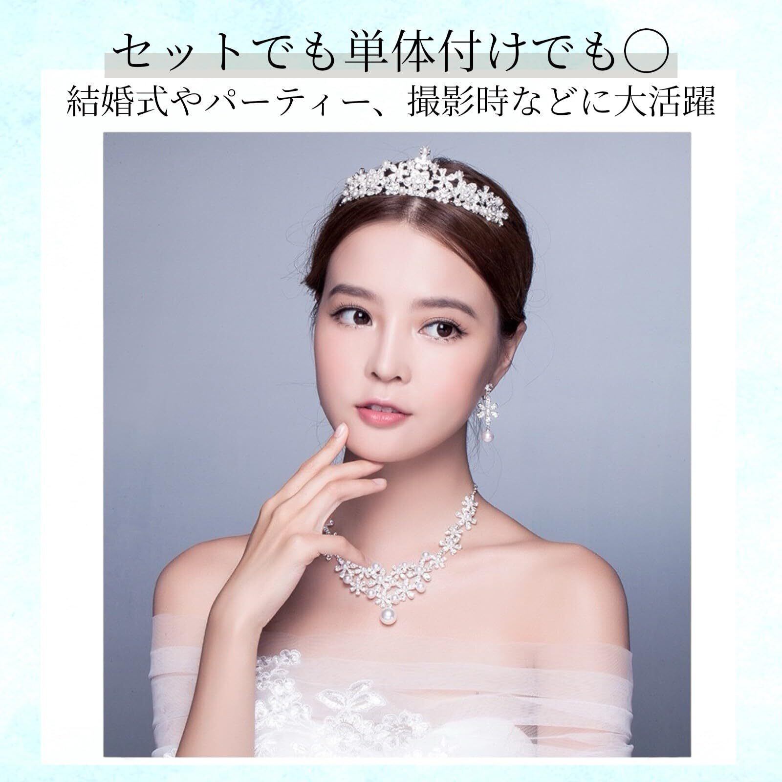【サイズ詳細】ティアラ:幅約14cm/高さ約4cm イヤリング・ピアス:全長約5cm ネックレス:長さ約45~50cm(アジャスター付きで調節可能)ヘアスタイルやドレスのデザインを選ばず、バランスよく身につけていただける使いやすいサイズ感です。華やかさを演出しながらも主張しすぎない絶妙なボリュームで、さまざまなシーンに合わせやすい仕様となっています。