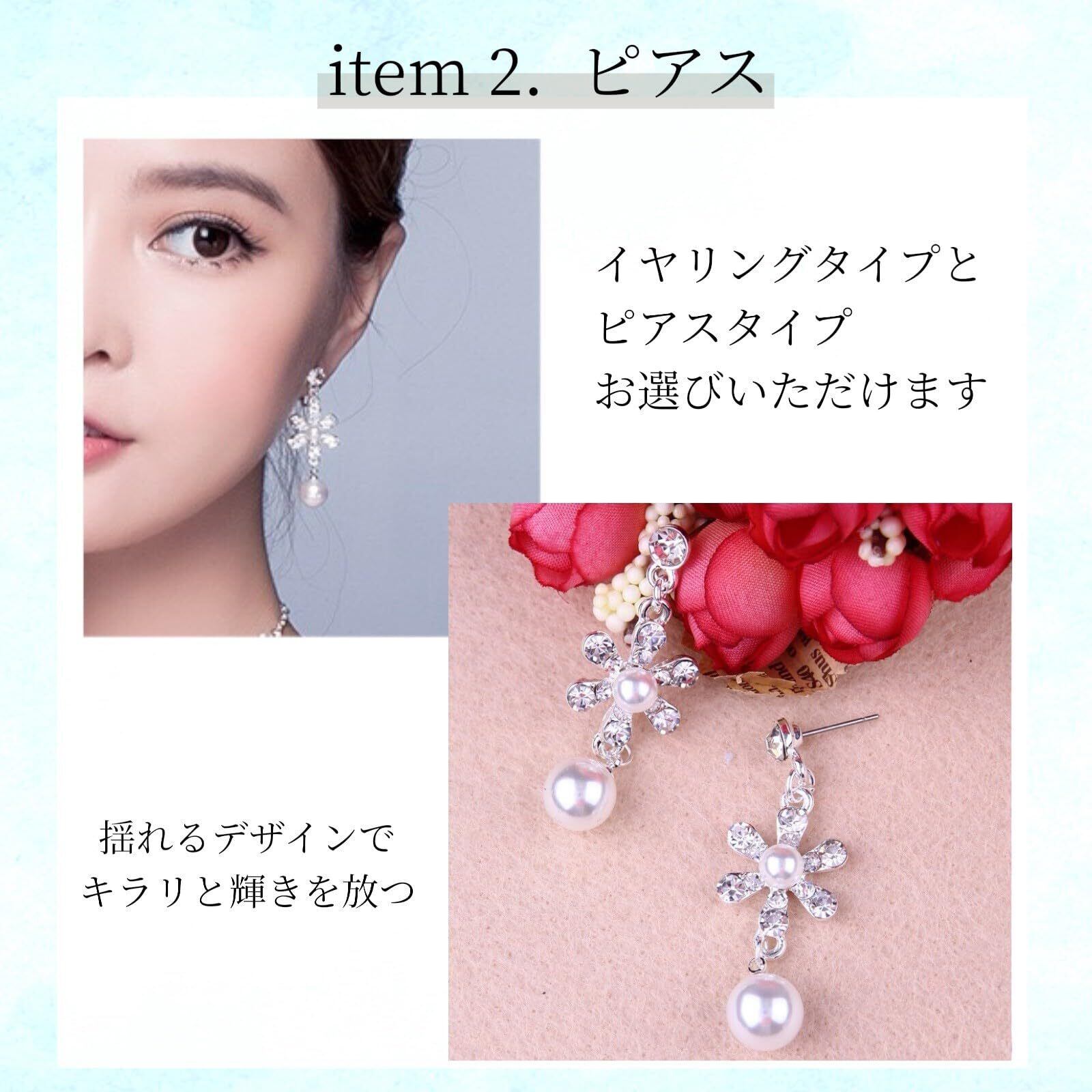 【デザイン】上品なパールときらめくラインストーンを贅沢にあしらった、華やかなフラワーモチーフのアクセサリーです。繊細な花のデザインが女性らしさを引き立て、顔まわりを明るく優雅な印象へと導きます。パールには「愛情」や「守護」といった意味が込められており、大切な人生の門出である結婚式やブライダルシーンにふさわしい特別な存在です。花嫁様はもちろん、前撮りや披露宴、パーティーなどさまざまな晴れの場面で美しく輝きを添えてくれます。