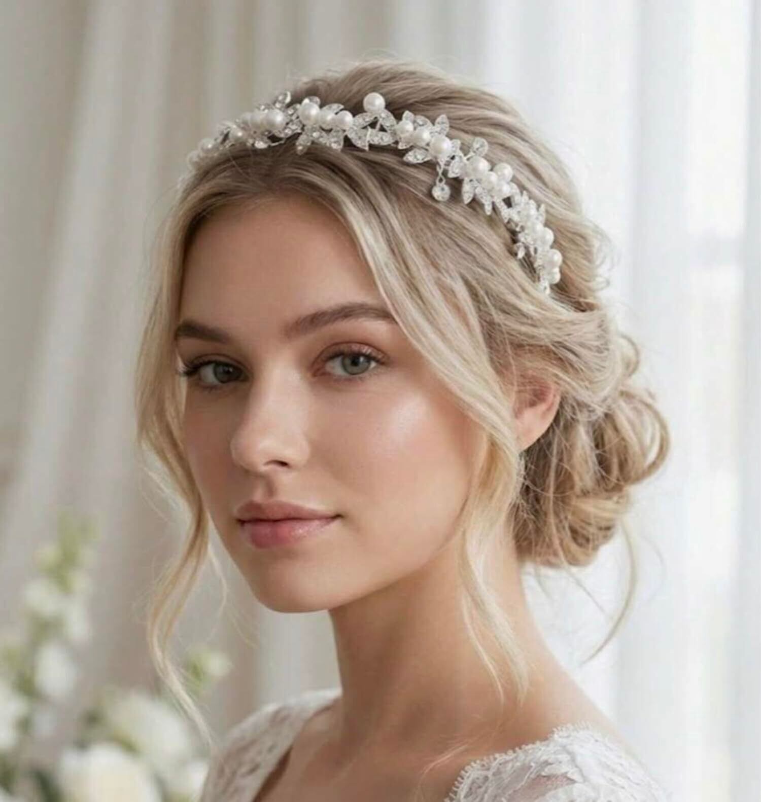 華やかに輝き、ウェディングドレスとの相性は抜群です。コームがなくヘアピンで固定するプリンセスタイプになります。