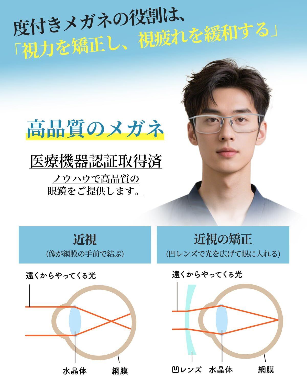 【UVカット&静電気防止コート】近視の補正を必要なメガネです。有害な紫外線を99%カットしますので、安心してご利用ください。蛍光灯や太陽光に含まれる有害な紫外線は100%(UV400)カットし、目を保護します。静電気防止コートが施されているため、埃がレンズに付着するのを防ぎ、クリアな視界を保ちます。