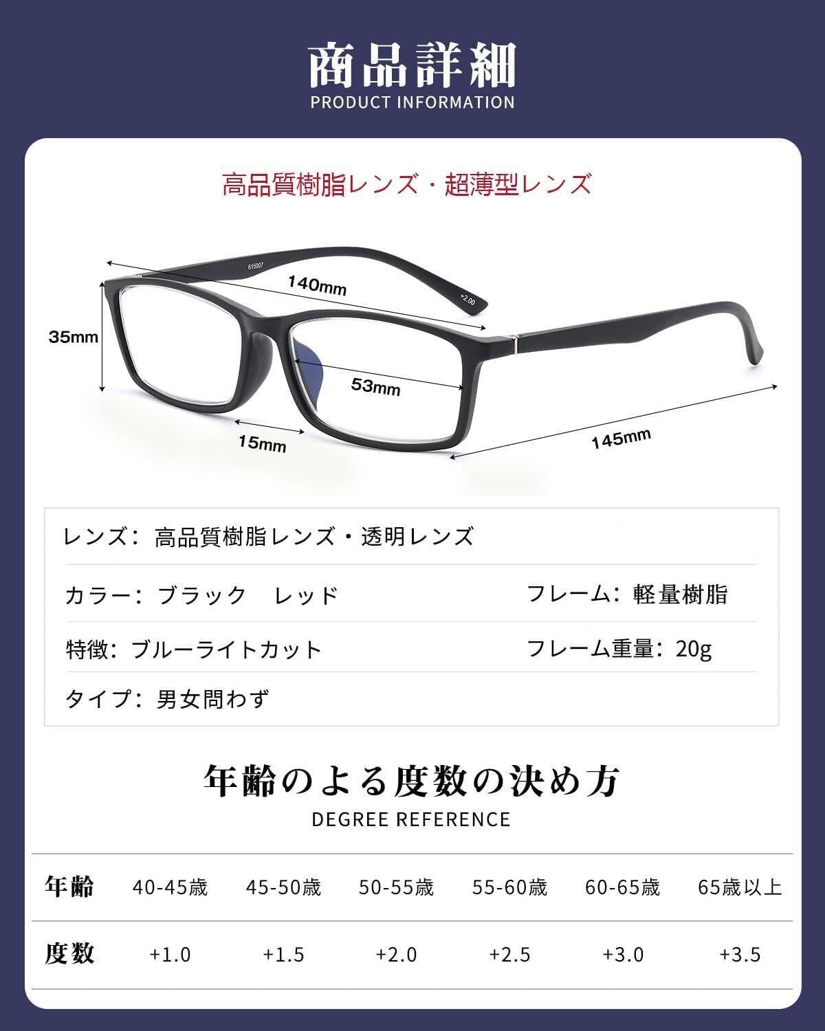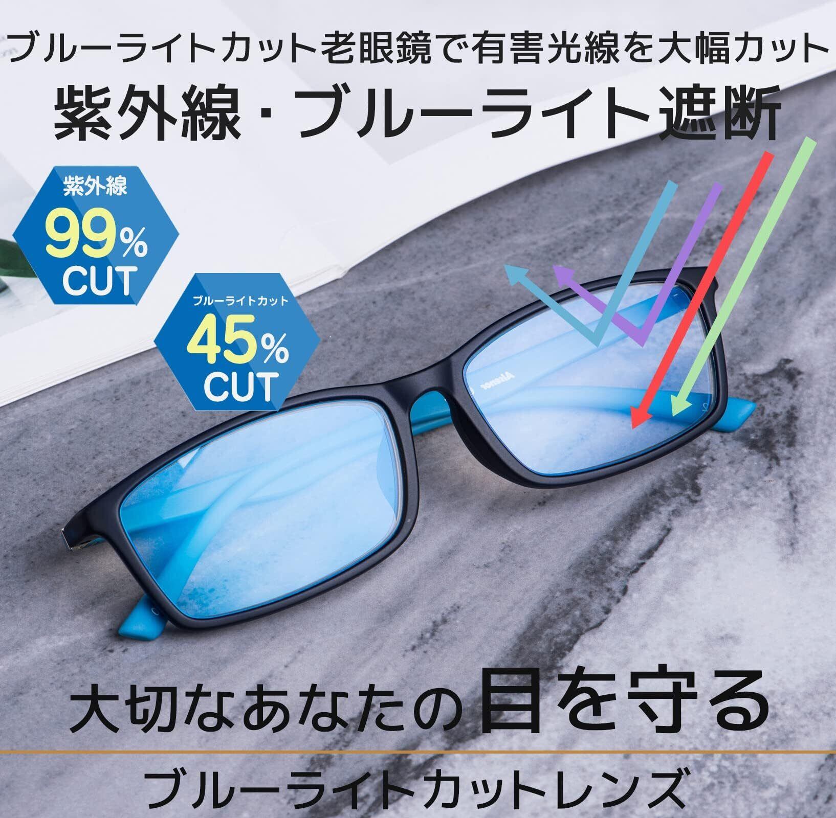 「ブルーライトカット&UVカット」ブルーライトの中でも特に強いHEV光線は睡眠障害や目の老化など眼疾患の原因といわれており、この老眼鏡はブルーライトを45%カットします、効果的に目の疲れを緩和し、視力を保護し、睡眠の質を向上します。おしゃれさだけでなく実用性もPC・スマホを長時間使用する人に。