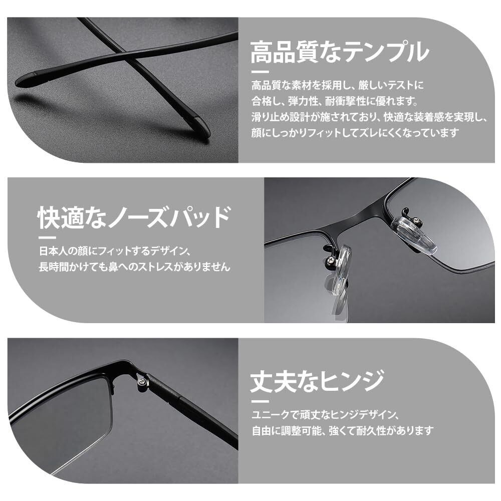 度数範囲:+1.0、+1.5、+2.0、+2.5の幅広い度数を備え、最適なものをお選びいただけます。付属品:外装ケースx1、メガネケースx1、メガネ本体x1、メガネ拭きx1、ブルーライトカットテストセットx1、変色説明書x1、取扱書x1