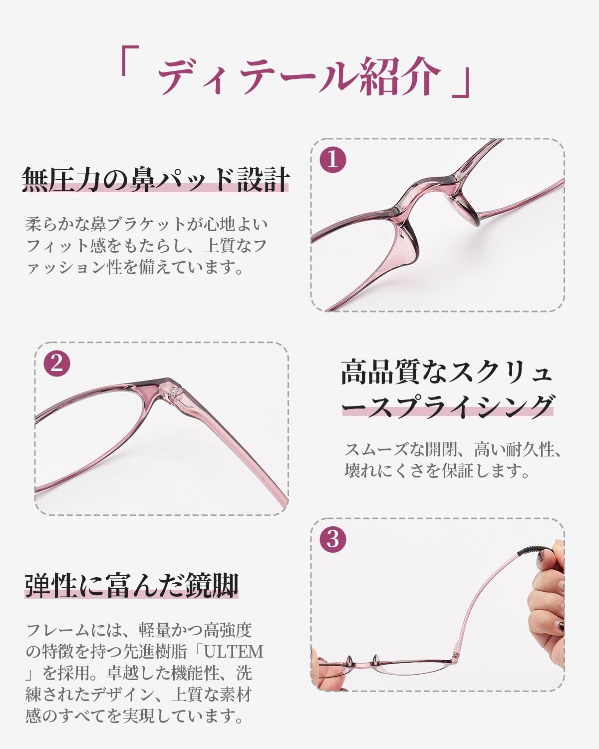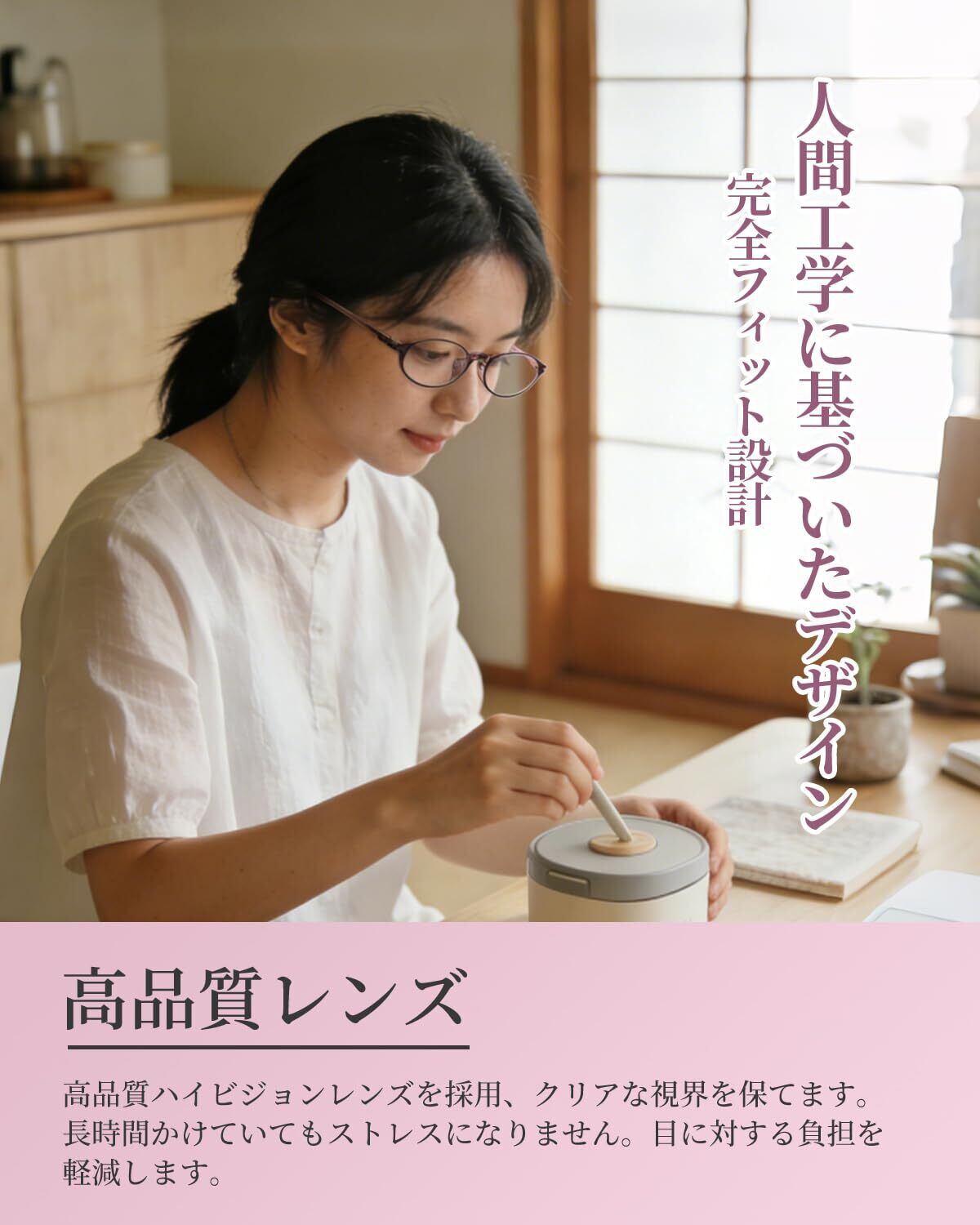 【精密設計の快適フィットとアジアンフィット】本品のフレームは横幅133mm、奥行き139mmのコンパクト設計。レンズは横幅50mm、縦幅27mm、鼻幅16mmと、アジア人(特に日本人)の顔の骨格や立体感に合わせたアジアンフィット設計を採用。瞳孔間距離を約60mmに最適化することで、多くの方にぴったりフィットし、ズレにくい安定したかけ心地を実現します。軽量でありながらもしっかりと顔をホールドする、快適な老眼鏡です。仕事中でもリラックスタイムでも、安定したフィット感を維持します。