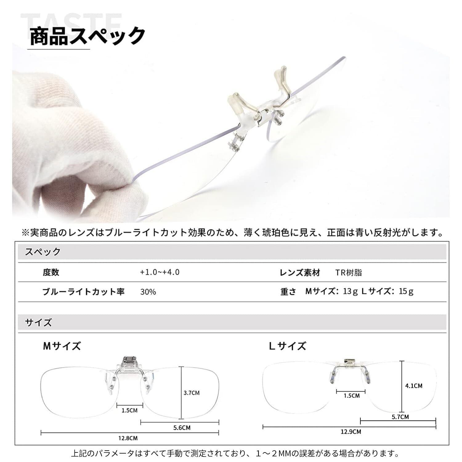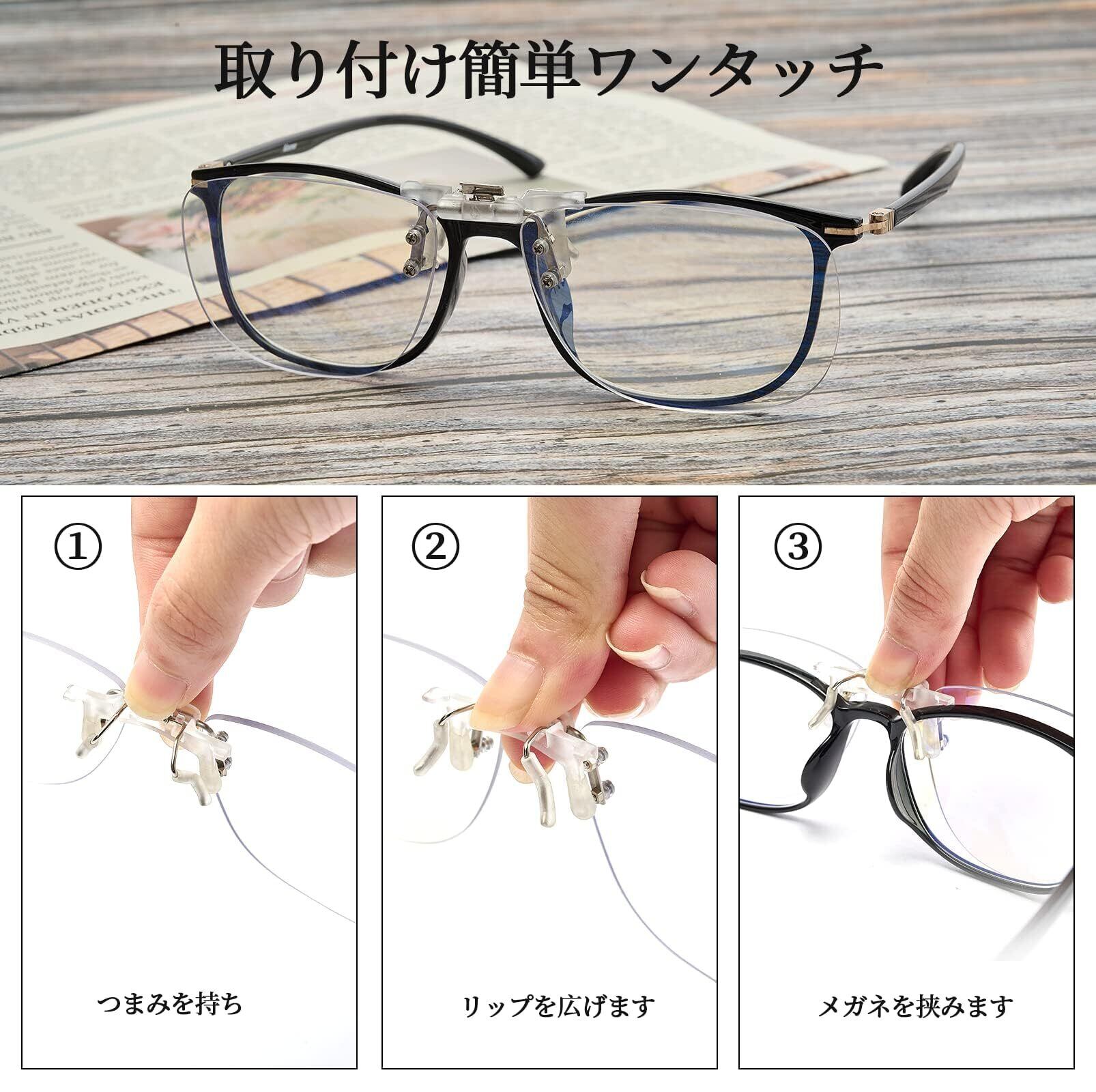 【簡単着脱】クリップ式でお使いの眼鏡に挟みこむだけで、いつもの眼鏡が老眼鏡に早変わり,片手で簡単に上げ下げできます。