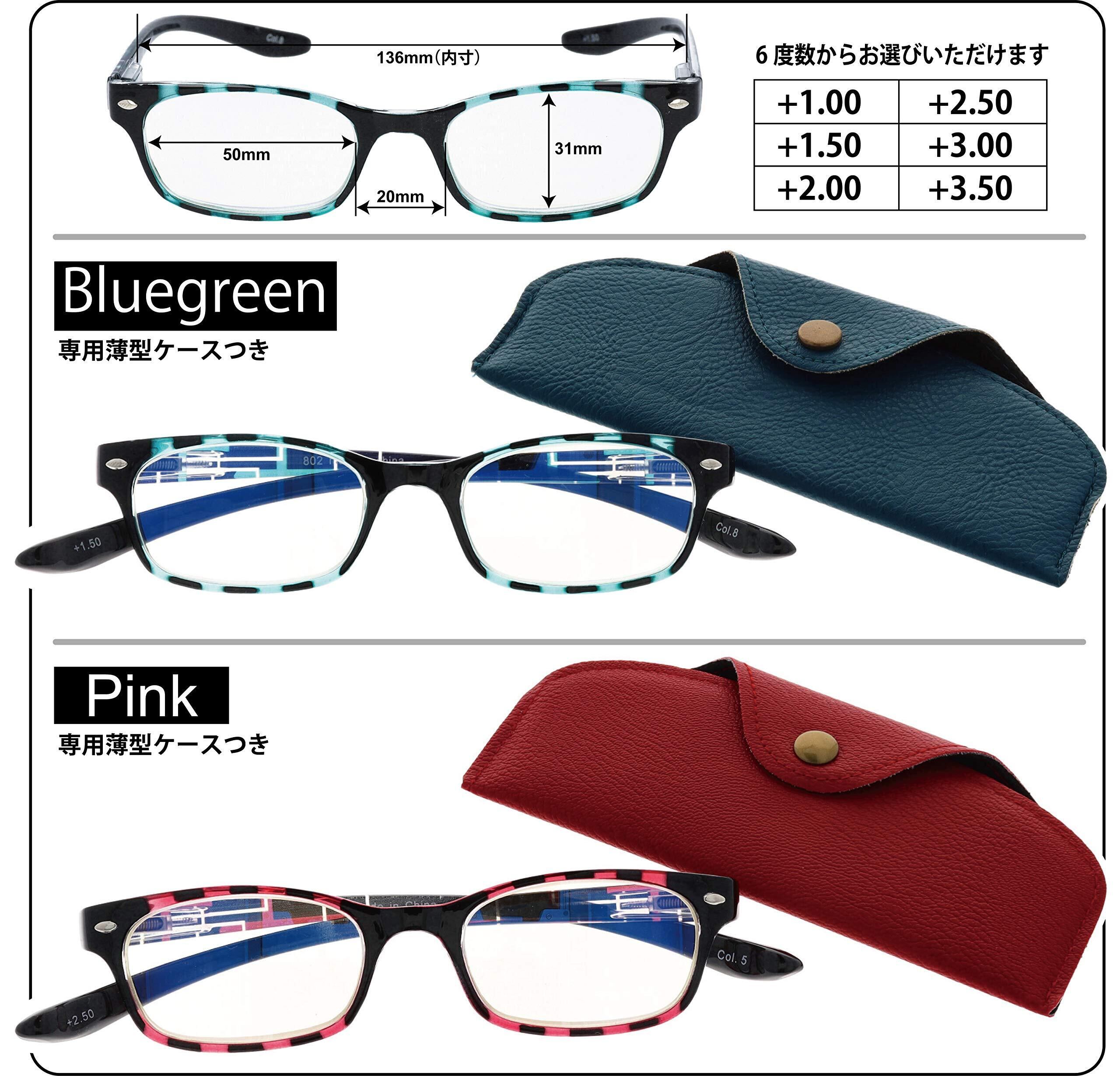 【シニアグラスでおしゃれに】老眼鏡に見えないデザインとカラー。誰でも似合いやすい丸みを帯びたスクエア型のフロント。ピンクデミはお顔を華やかで明るい印象に。ブルーグリーンは爽やかで若々しい印象に。その日の気分やお洋服に合わせてコーディネートをお楽しみください。つるの部分の柄もおしゃれで、老眼鏡に見えません。首から提げているときは、おしゃれなアクセサリー感覚で胸元を飾ります。
