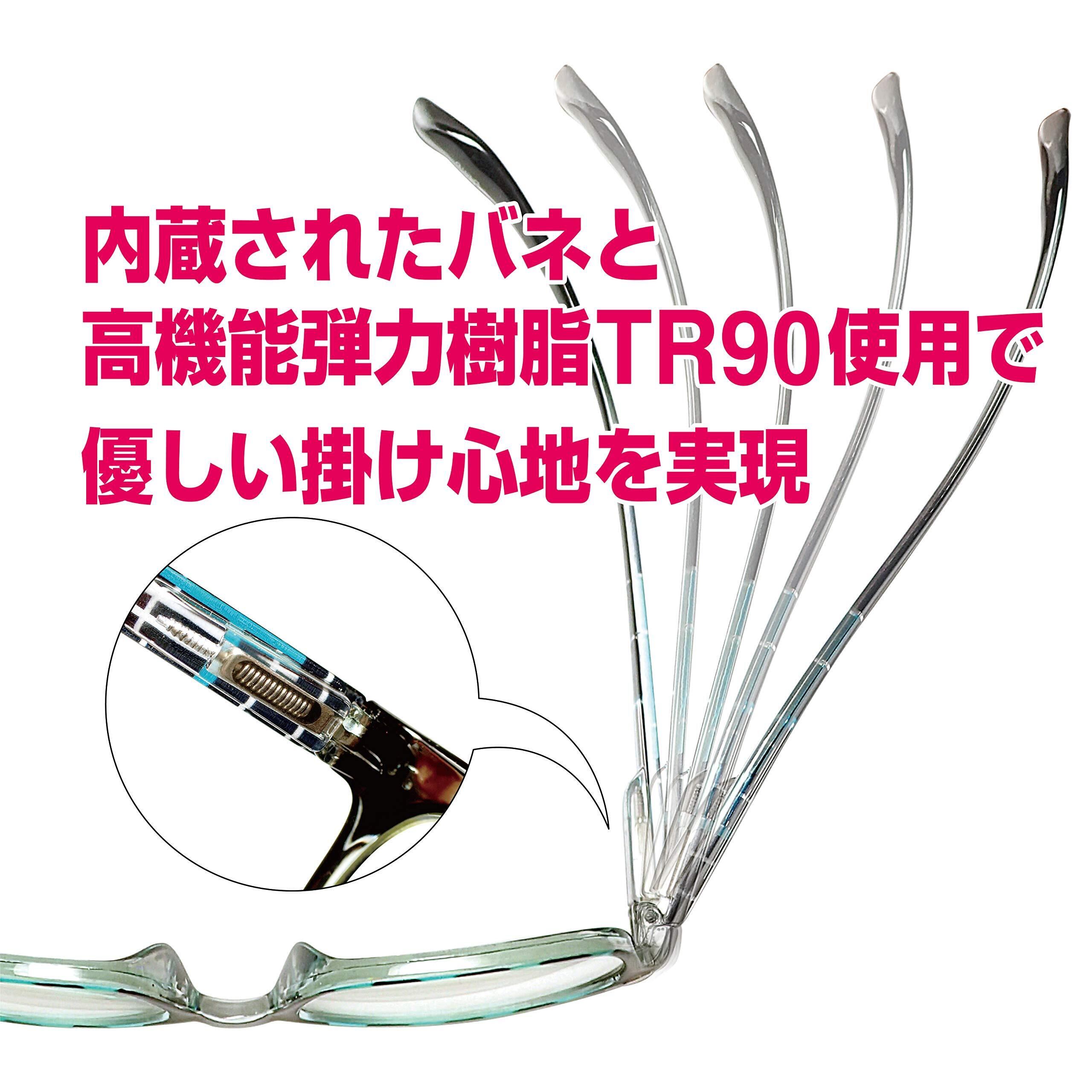 【掛け外しラクラク&柔らかな掛け心地】遠くを見たり、近くを見たり、掛け外しが多い老眼鏡。丁番にバネが内蔵されており、つるが90度以上開くので、掛け外しがスムーズです。素材は軽くて弾性のある「TR90」を採用しており、長時間の使用でも疲れない柔らかな掛け心地。長いテンプルは、頭の形状を優しくホールドするように設計されており、下を向いた時にズレ落ちにくくなっております。テンプルは長いですが、通常のメガネと比べて使用感に違和感はありません。