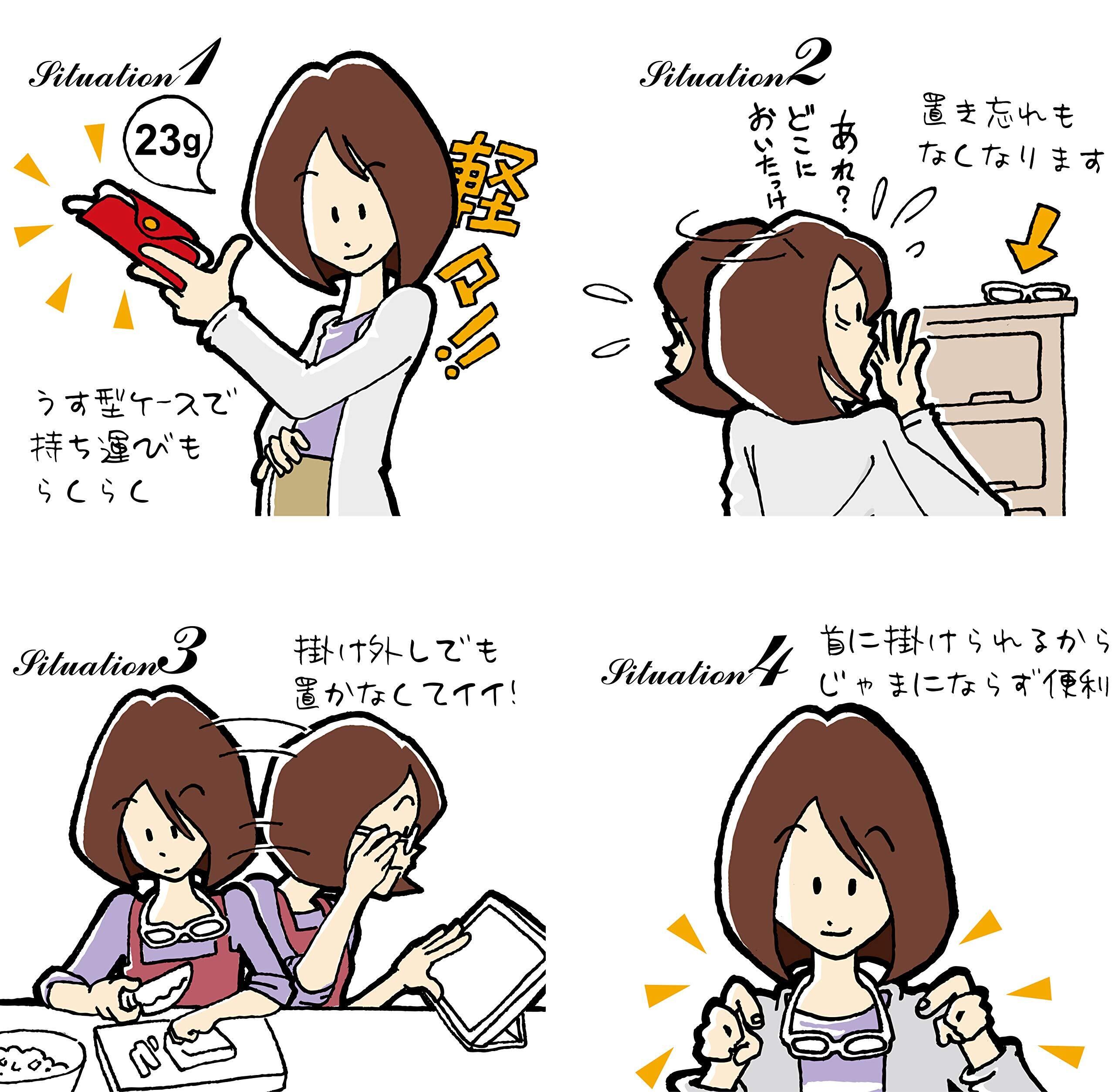 【超軽量&持ち運び便利】わずか23グラム。首に掛けた時、掛けていることを忘れるほどの軽さです。肩こりの心配はありません。付属のケースはレンズ部分のみを覆って、テンプルは外に出ている薄型タイプです。メガネを収納している時も、とてもコンパクトです。小さなポーチやカバンにもすっぽり収まります。
