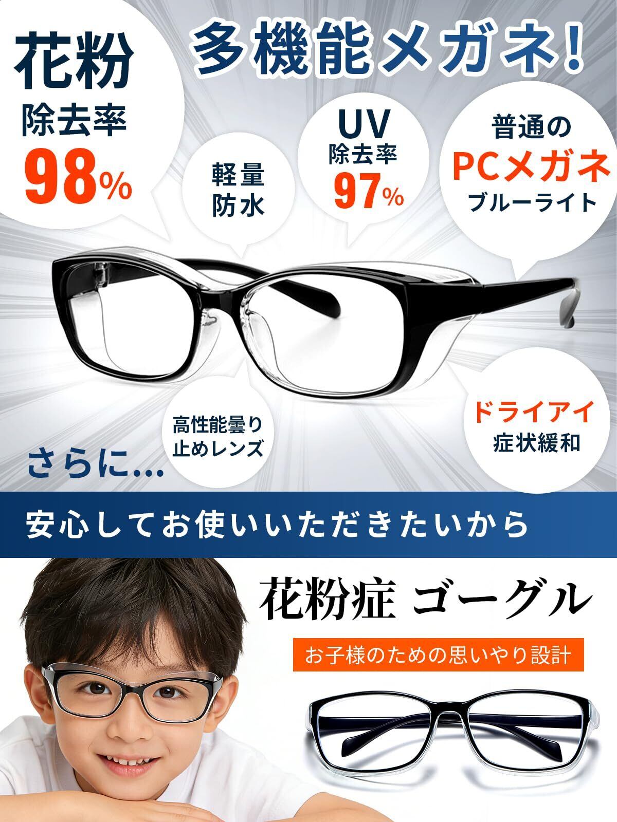 【人気商品】花粉 メガネ 子供 花粉 メガネ キッズ 両面曇り止めレンズ ブルーライト UVカット飛沫 紫外線 粉塵ブロック対策