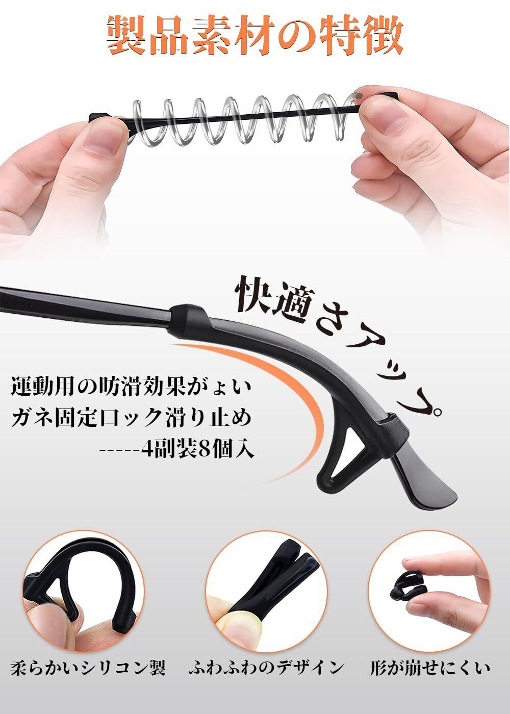 【固定防滑アップグレード】激しい動きでもずれ落ちない 伸縮性のあるソフトシリコン素材に、内側に滑り止め加工を施し、テンプル先端にしっかりフィット。ランニングや球技、登山などの激しいスポーツはもちろん、日常生活での前かがみの姿勢でも、メガネをしっかり安定させ、頻繁なずれ落ちを防ぎます。