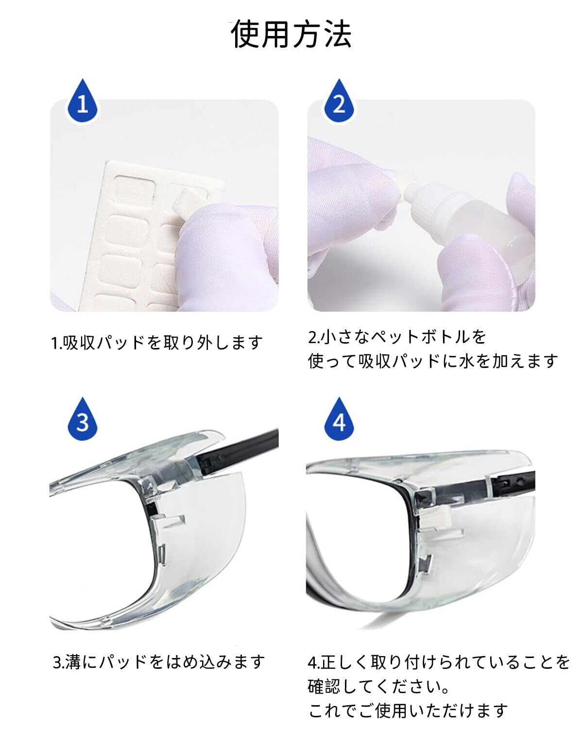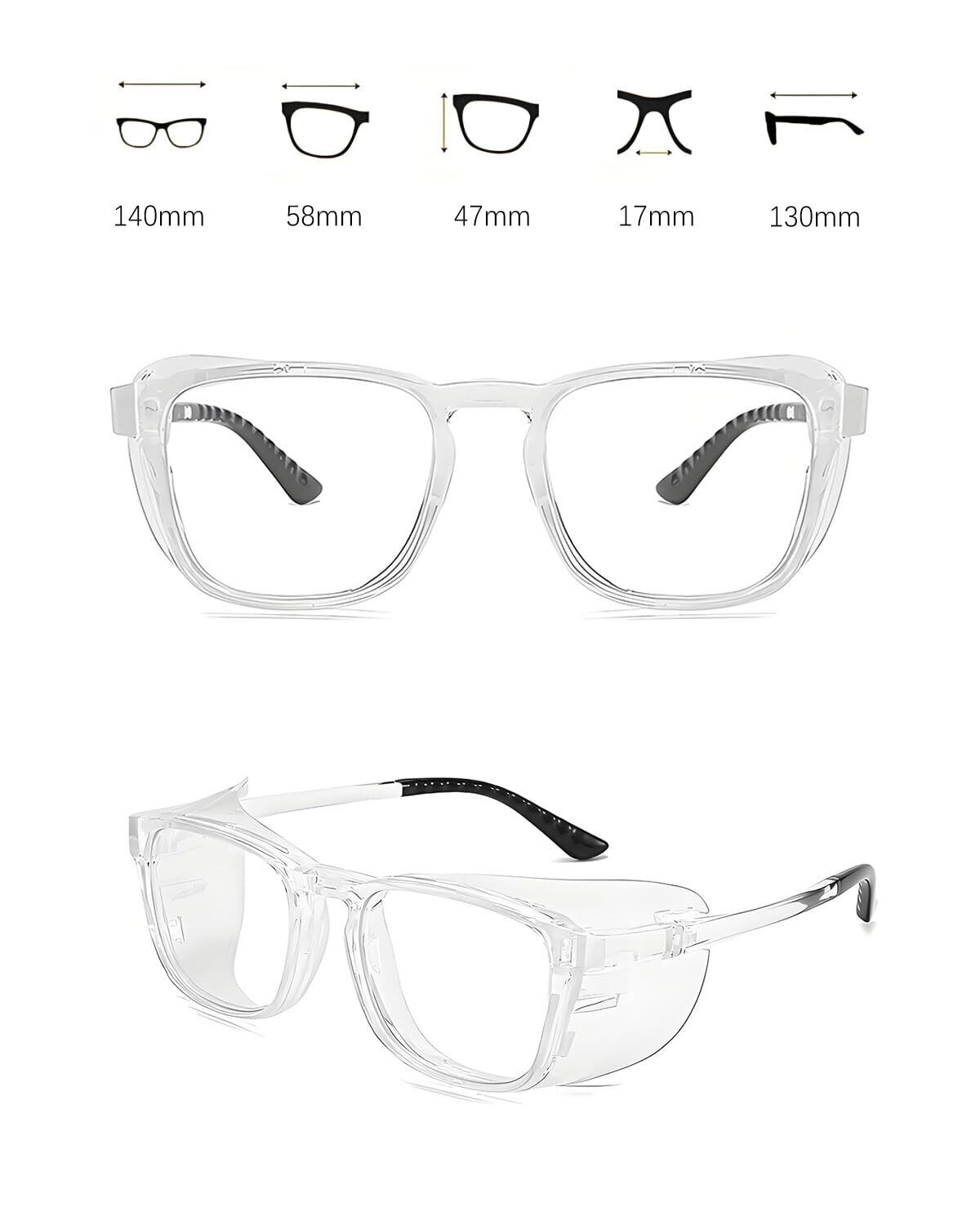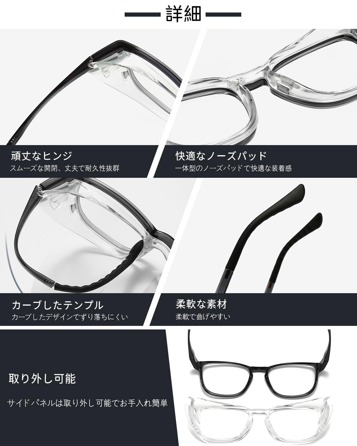 【サイドシールドデザイン】:一体型の透明なサイドシールドを備えたこのメガネは、従来のメガネよりも優れた保護力を提供します。サイドシールドは簡単に取り付けることができ、外れたり紛失したりすることはありません。飛沫、ゴミ、唾液、花粉、ほこりなどを効果的に遮断し、優れた周辺視野と保護を提供します。