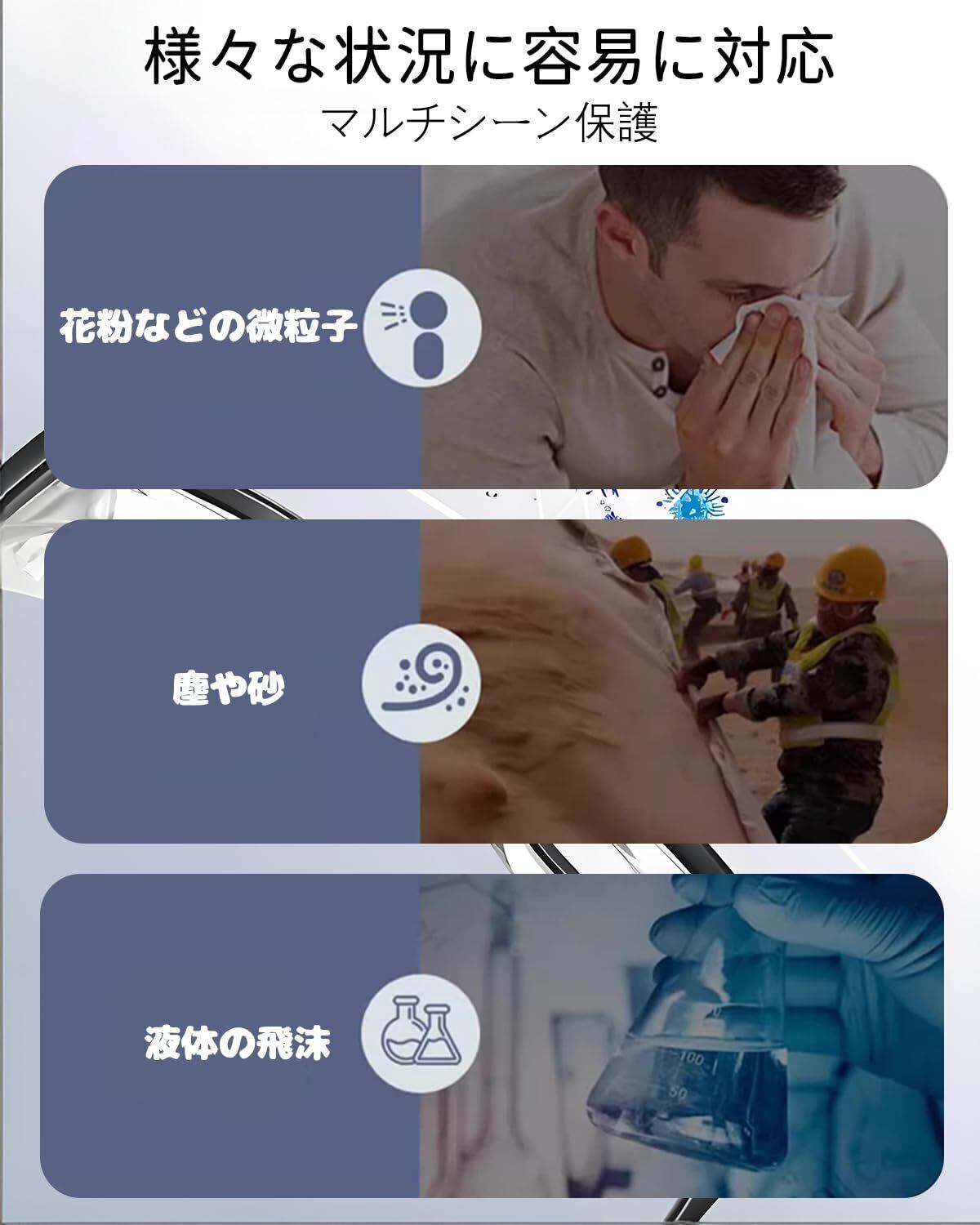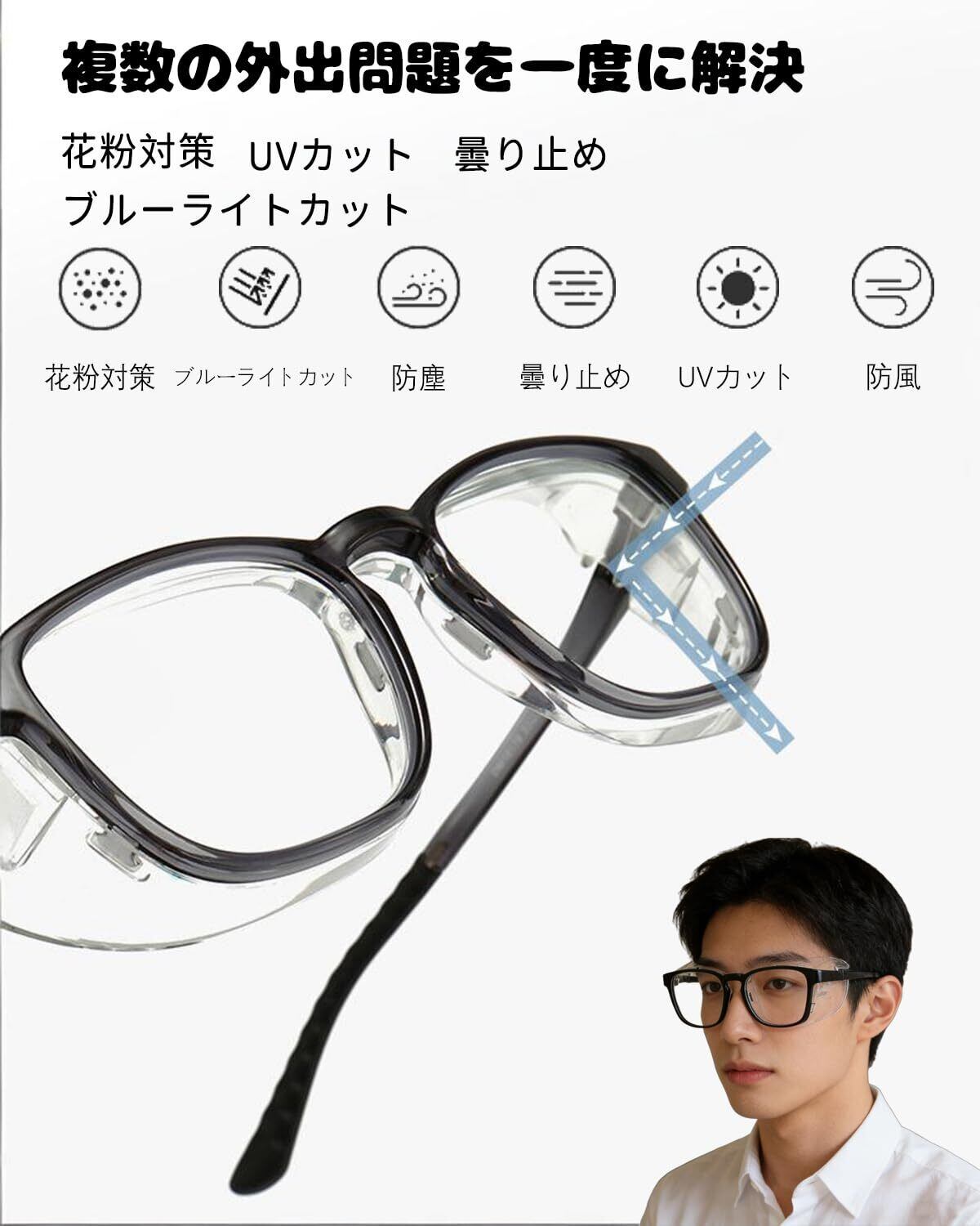 【高効率保護】:透明な防風サイドシールドを備えたこのメガネは、花粉、飛沫、ほこりを99%効果的にブロックします。一体型のノーズパッドが自然で快適なフィット感を実現します。花粉の季節でも、アウトドアアクティビティや毎日の通勤を安心して楽しめます。