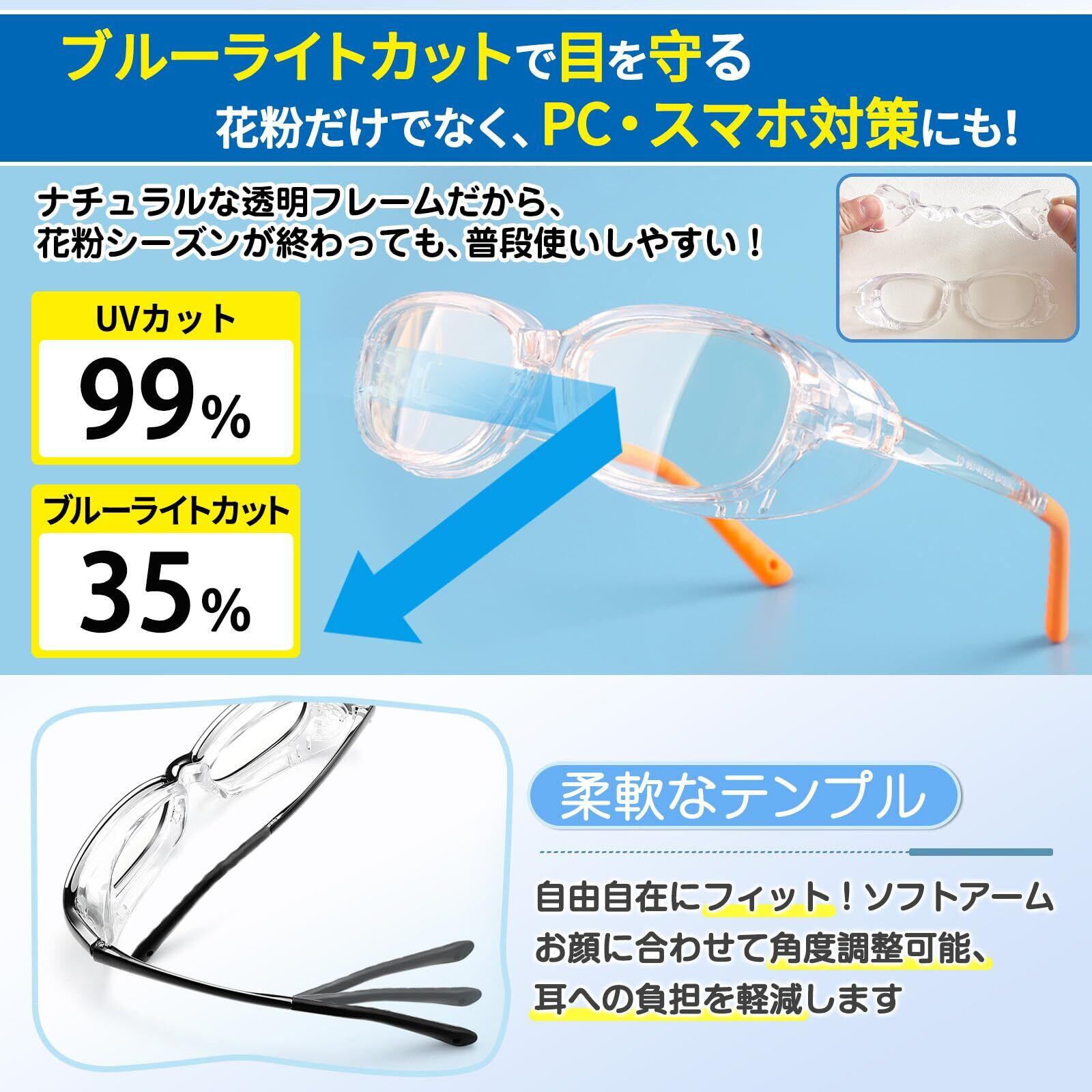 【両面高性能曇り止めコート&ブルーライト35%カット&UVカット99%】曇り止め効果が非常に優れており、PC製透明レンズの両面に高性能な曇り止めコートを施しているため、快適な視界を一日中確保できます。レンズはブルーライト35%カット、UV紫外線99%カットの機能も搭載。花粉、粉塵などをブロックだけでなく、スマホやタブレットなどの青色光を効果的に遮断し、目を守ります。また、紫外線を99%カットし、普段の紫外線から目を守り、直射日光を避ける効果も高いです。フィット感が良く、使用後はまるごと水洗いができ、いつでも清潔に保てます!長時間使用しても曇りにくく、くもり止めクロスでレンズを拭くだけで、長時間曇り止め効果が持続します。
