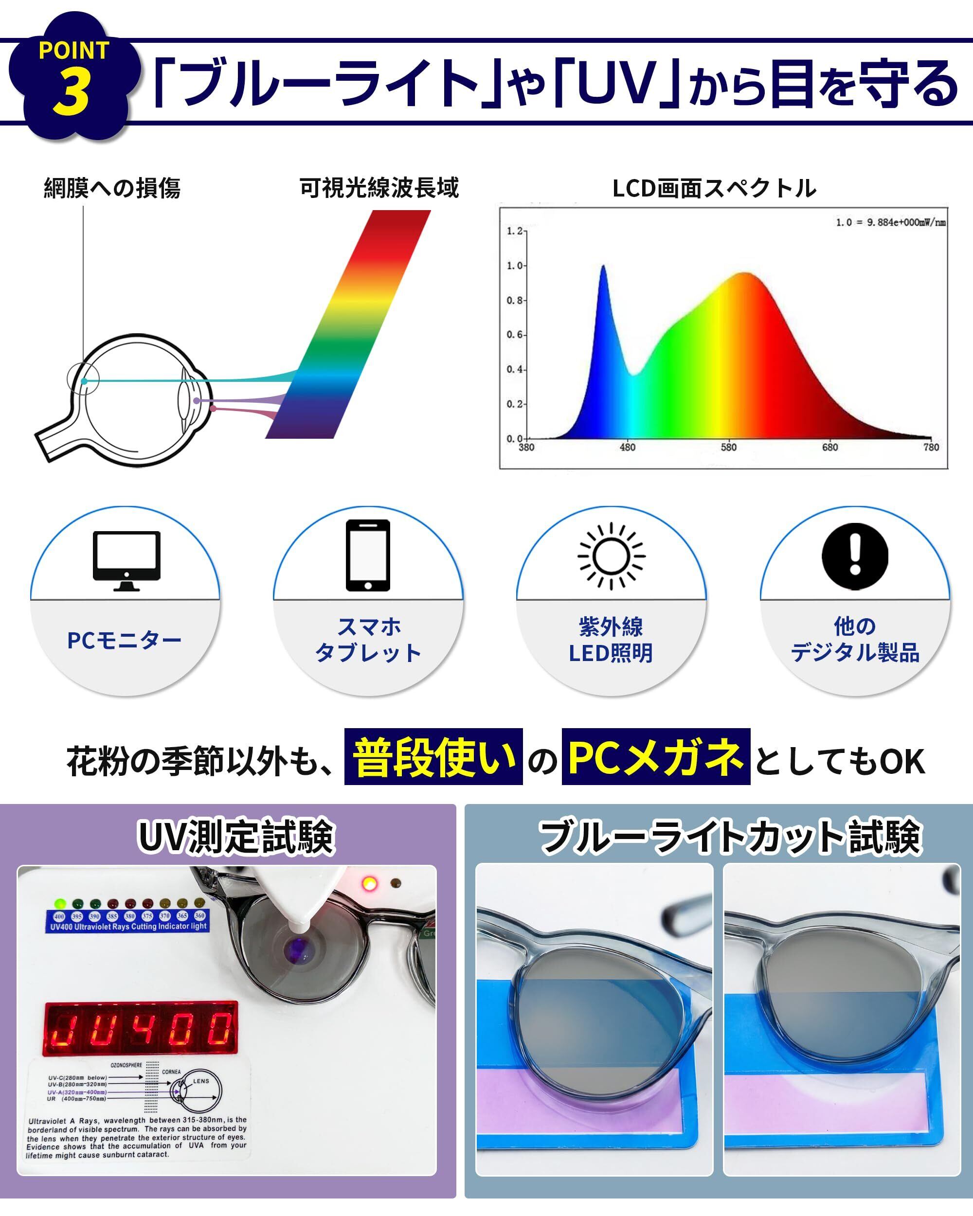 【深めの透明フード・花粉防止メガネ・防塵・保護メガネ】 深めの透明フードが顔との隙間を最小限に抑え、花粉や黄砂の侵入をブロック。紫外線対策も万全です。レンズ周辺がせり出した構造で目元をしっかりカバー。立体設計のフレームが顔に密着し、花粉・黄砂・飛沫・粉塵から目を守ります。※本品は肌に密着させるスポンジタイプとは異なり、レンズ主体の設計のため、完全な密閉ガードはできません。あらかじめご了承ください。